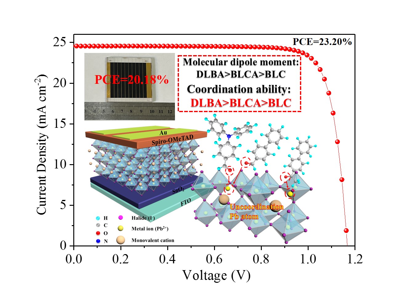 该工作系统地选取了一系列具有单羰基基团和大π电子共轭体系结构的羰基添加剂分子,经详细研究发现:高偶极性的羰基钝化剂在减少了钙钛矿薄膜缺陷、改善了钙钛矿层与空穴传输层之间的界面接触、增强器件光电转化效率和长期稳定性方面占有相对优势,揭示分子偶极子越强,越有利于增强羰基添加剂的钝化效果。在此基础上选择相对高偶极子性的添加剂,构筑效率为23.20%的正式钙钛矿太阳能电池,制作的大面积钙钛矿模块(14 cm2)的效率高达20.18%。该工作揭示分子偶极子对有机添加剂分子作用效果的重要性,为未来设计制备高效稳定的钙钛矿太阳能电池器件的新型有机添加剂提供新的有力依据。