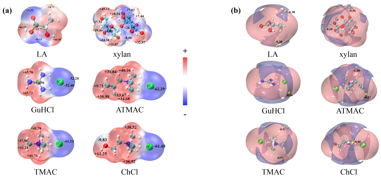 图1 低共熔溶剂和半纤维素的静电势以及范德华势分析