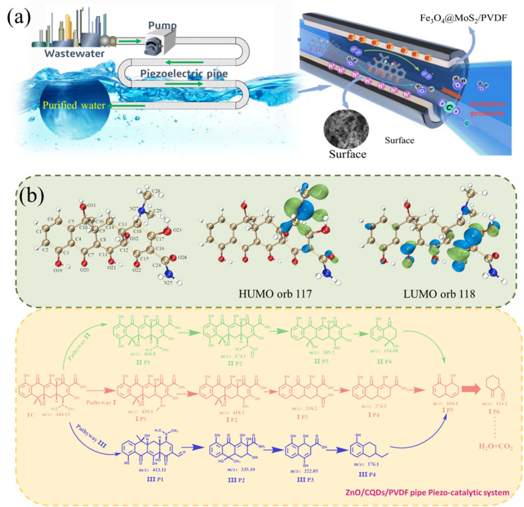 图2 (a)水流动力驱动压电催化体系;(b)四环素压电催化降解途径