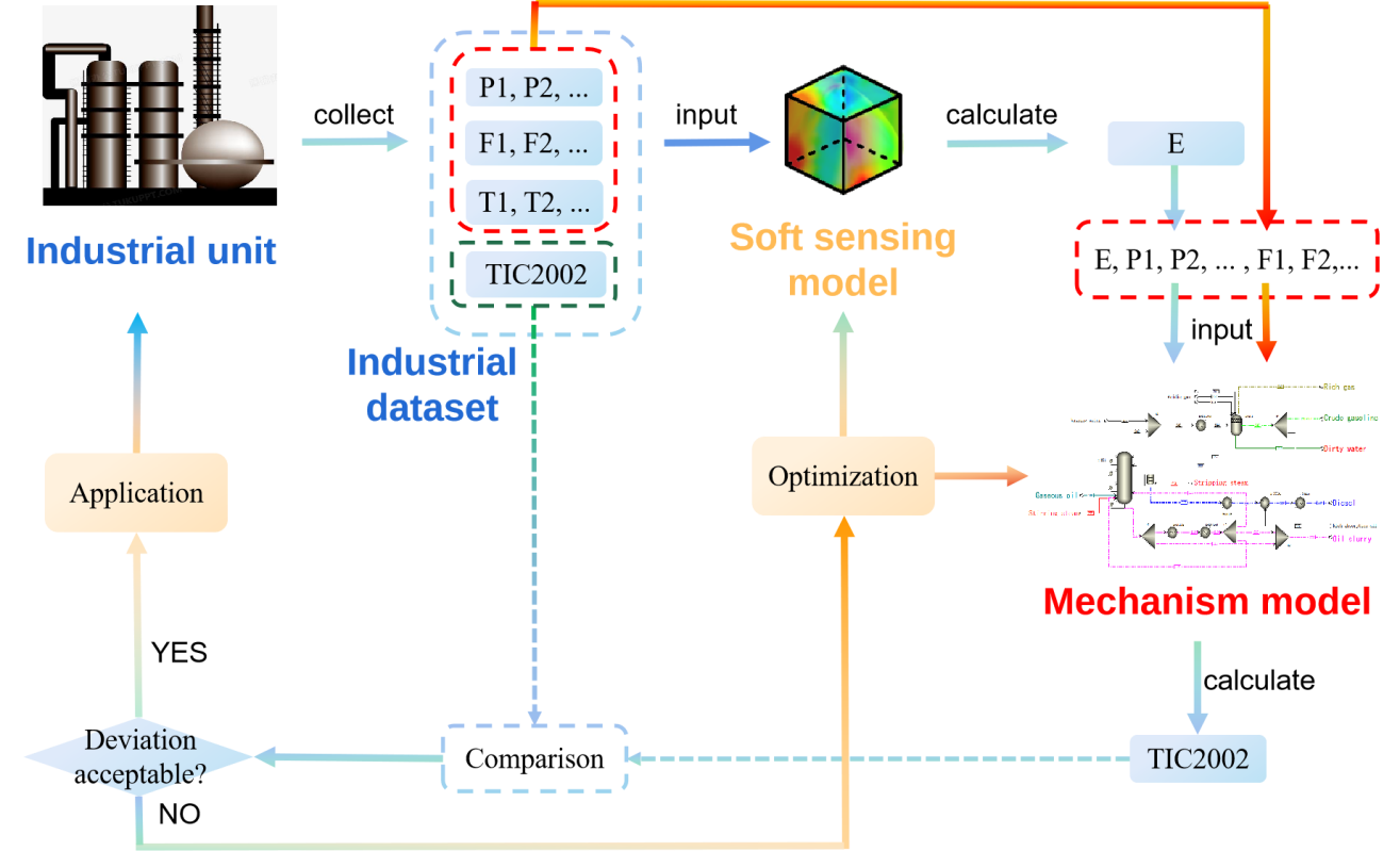 其次,化工过程中存在大量不可观测的隐性变量,田文德教授团队以典型不可观测变量——精馏塔板效率为例,开展基于机理深度学习的软测量方法研究。他们利用大数据聚类凝聚装置的工况特征,作为机理建模的输入条件,开展分馏过程多特征工况模拟,获得塔板效率与过程可测参数的关联数据集。基于深度学习算法构建塔板效率的实时软测量模型,实现塔板效率的实时监测。所提技术的可靠性在工业催化裂化装置的分馏塔中得以验证,并在可靠性领域顶级期刊Reliability Engineering & System Safety(中科院一区TOP,IF=8.1)上发表了文章“Mechanism-based deep learning for tray efficiency soft-sensing in distillation process”(论文链接:https://doi.org/10.1016/j.ress.2022.109012)。XC体育为论文的第一单位,XCSport田文德教授为论文的通讯作者,博士研究生王少辰为第一作者,实验室老师李传坤、刘彬、崔哲参与指导工作。