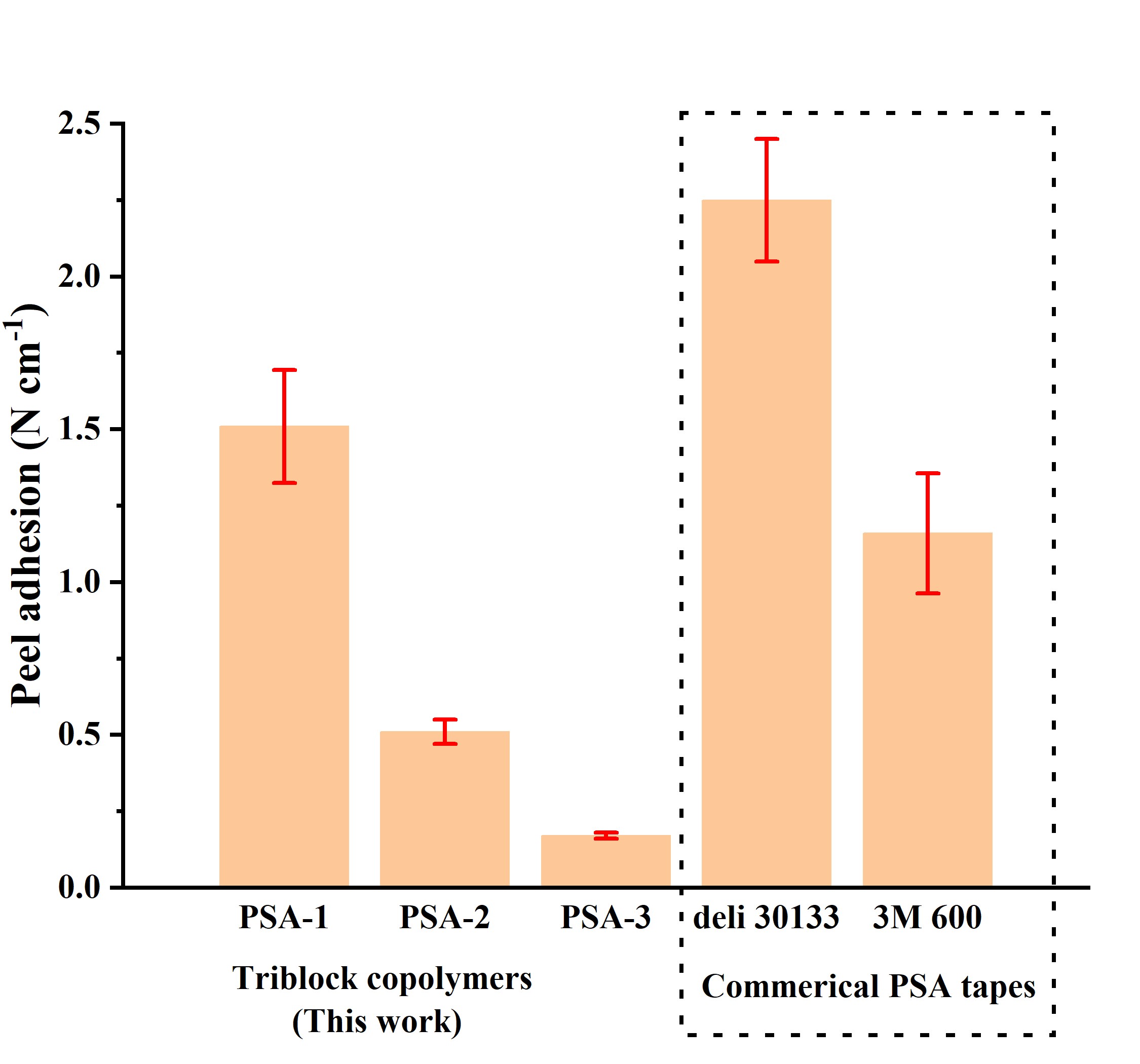 图3.制备得到的三嵌段共聚物180°剥离强度测试结果。PSA-1: PLLA-b-PδOL-b-PLLA, PSA-2: PLLA-b-PδUL-b-PLLA以及PSA-3: PLLA-b-PδTL-b-PLLA