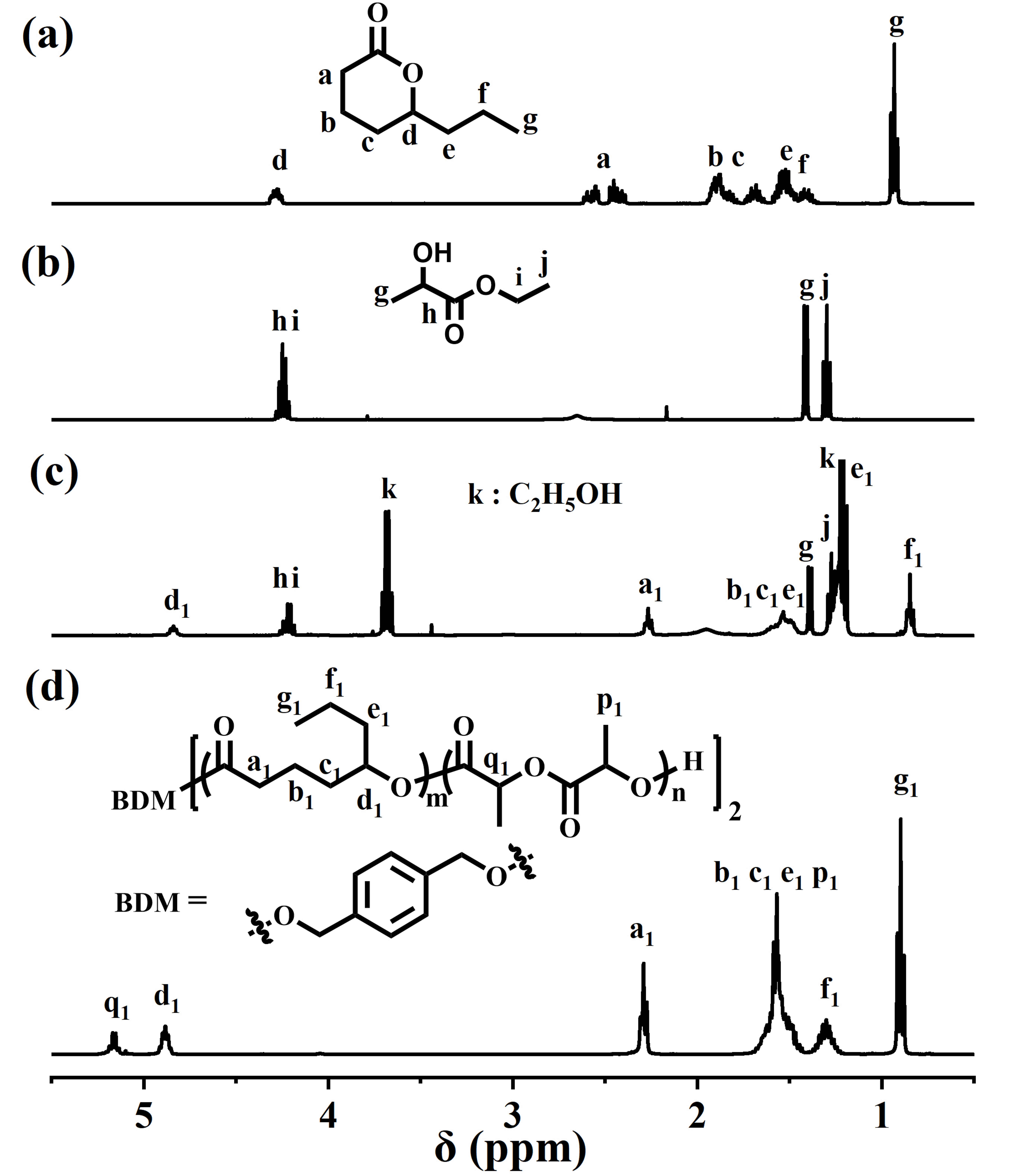 图4.核磁氢谱:(a)原始δOL(b)乳酸乙酯(c)回流后混合物(d)PLLA-b-PδOL-b-PLLA