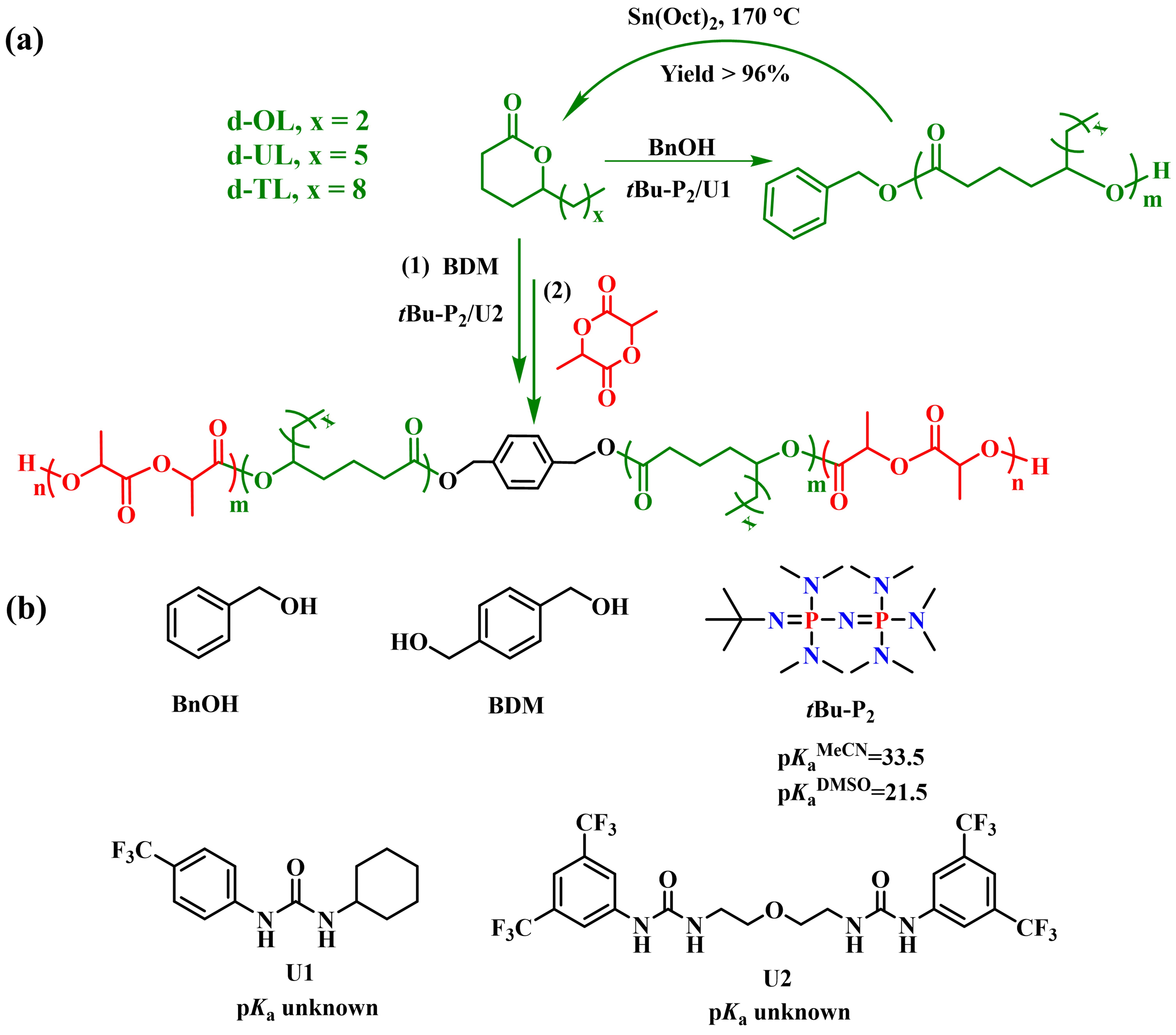 图1.(a)利用δ-取代六元环内酯制备可闭环回收聚酯;(b)引发剂、有机碱以及脲的化学结构