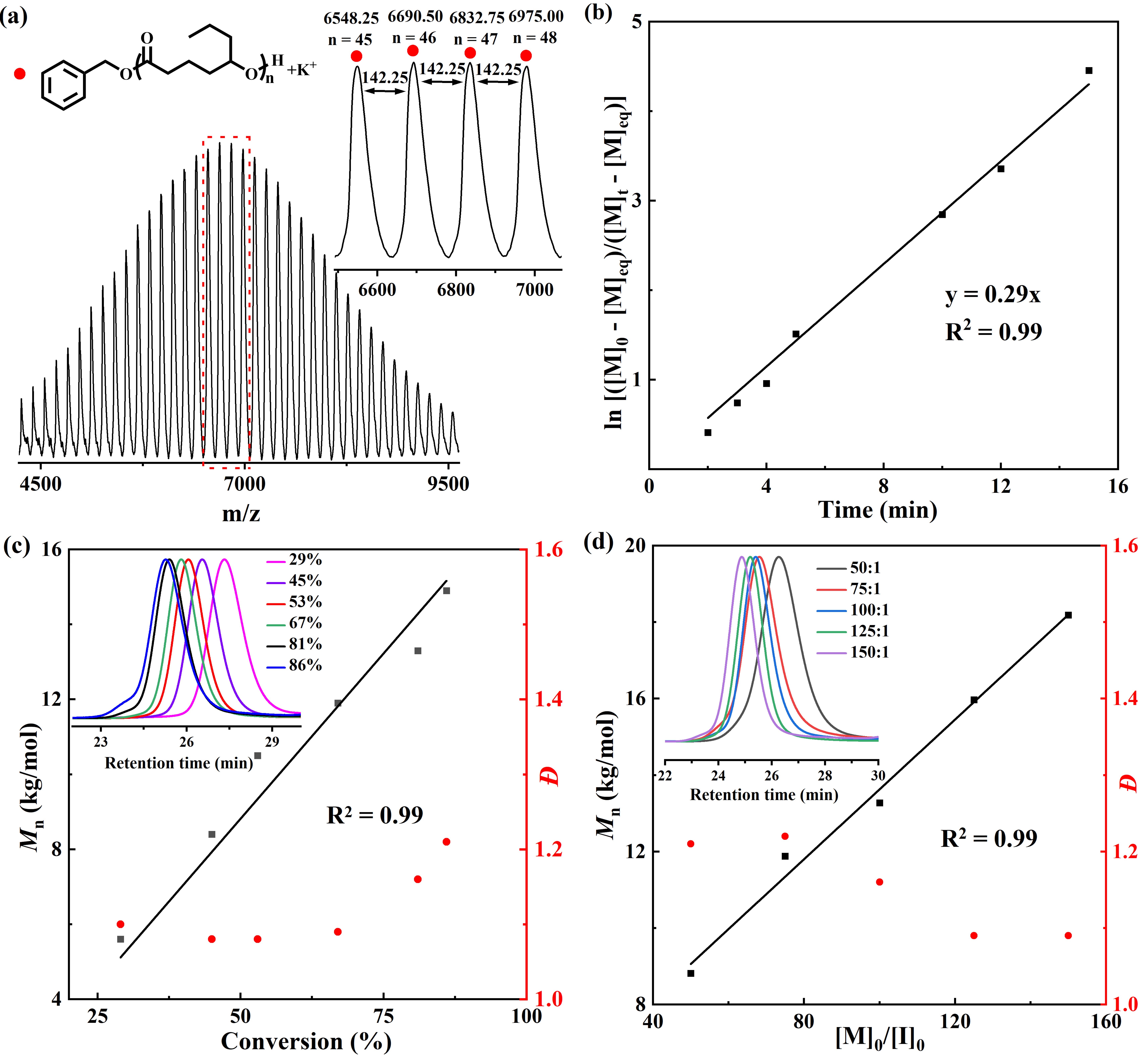 在本工作中,他们使用tBu-P2和脲二元催化体系,成功实现了商品化δ-辛内酯(δOL),δ-十一内酯(δUL)和δ-十四内酯(δTL)在室温本体条件下的“活性”/可控开环聚合(图1)。开环聚合相对于单体浓度呈现一级动力学,其表观速率常数分别为0.29,0.31和0.30 min-1。δ-取代六元环内酯侧链长度对聚合动力学无明显影响。与过去报道的有机酸DPP催化体系(TOF = 0.71 h-1)相比,tBu-P2/脲二元催化体系的催化活性(TOF = 486h-1)大幅提高。进一步研究聚合热力学发现δOL,δUL和δTL在25°C下的聚合吉布斯自由能分别为-0.20,-0.95和-1.34 kJ mol-1。因此,随着侧链取代基长度的增加,δ-取代六元环内酯在热力学上更易开环聚合。需要指出的是,以辛酸亚锡为催化剂,得到的三种聚酯在170°C下通过减压蒸馏可以完全解聚回收得到高纯度的δOL,δUL和δTL(产率~96%)(图2)。回收得到的δ位取代六元环内酯可重新聚合,聚合效果与初始单体没有区别。