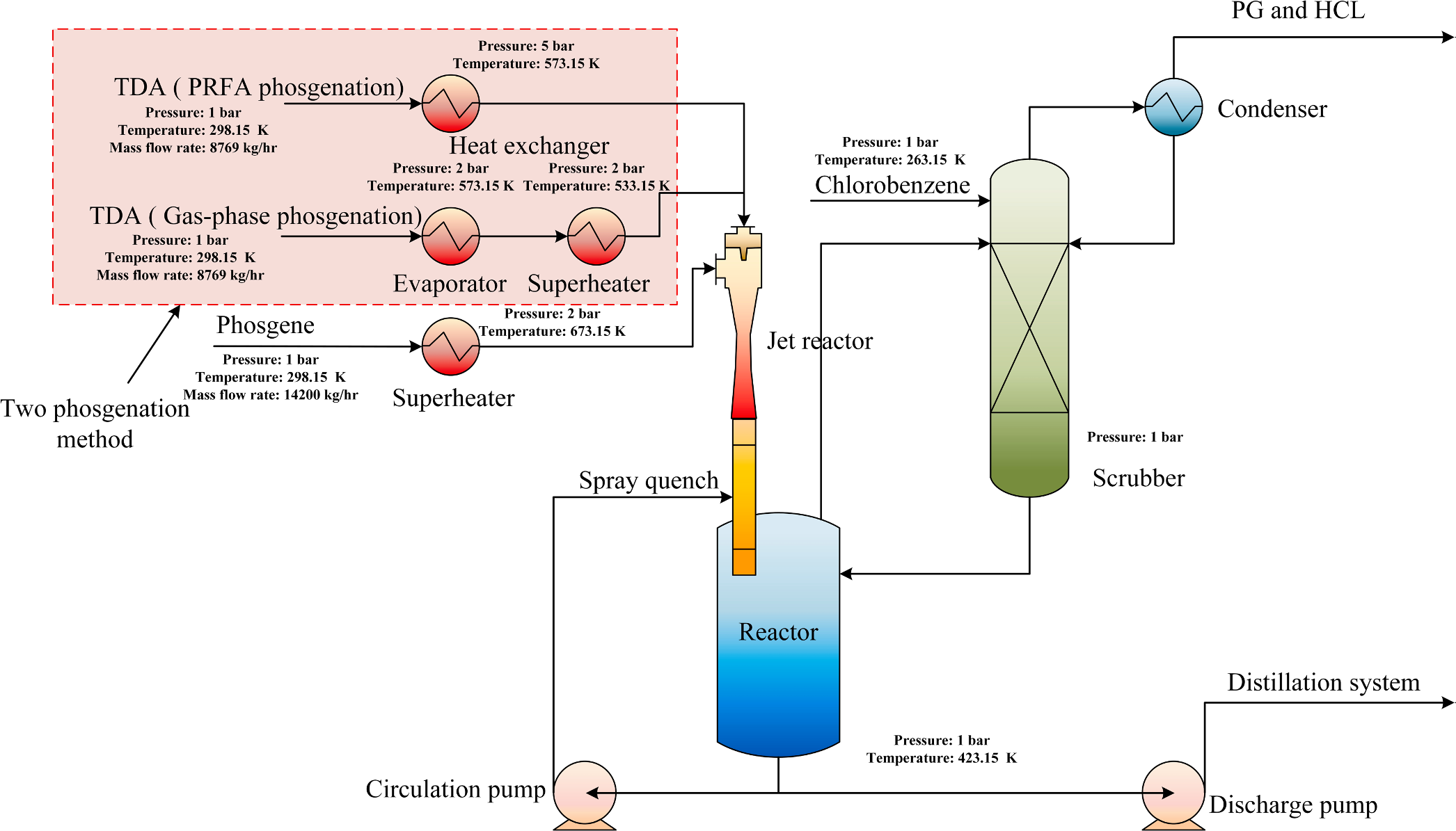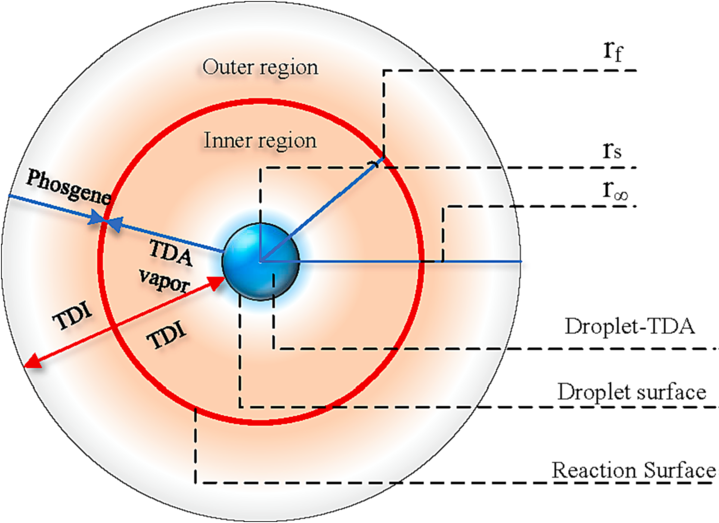 甲苯二异氰酸酯(TDI)是生产聚氨酯的基本原料,主要用于生产软质聚氨酯泡沫及聚氨酯弹性体、涂料、胶黏剂等,是一种被广泛使用的关键化学原料。目前TDI最先进的生产工艺是通过甲苯二胺(TDA)与光气反应的气相光气化法合成,但该工艺仍存在能耗高、高温副反应多等缺点。XCSport毕荣山副教授团队针对TDI合成工艺提出了一种闪蒸雾化辅助光气化方法(PRFA),该方法将TDA在反应器中闪蒸雾化成微液滴,微液滴与高温气态反应物接触,使TDA微液滴瞬间汽化并发生光气化反应(反应机理如图1所示),从而降低TDA蒸发和升温所需的能耗。