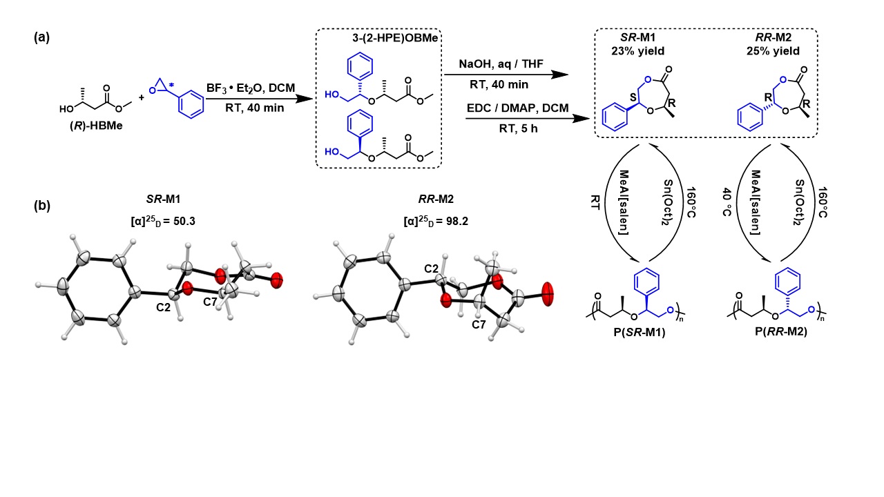 这项工作进一步完善了生物基塑料P3HB的高效升级循环策略,制备得到了立构规整、具有力学性能、可闭合循环的新型聚醚酯材料,同时揭示了手性构型对氧杂环内酯开环聚合以及聚合物性质的影响,为开发新型可持续材料提供了重要的理论基础。