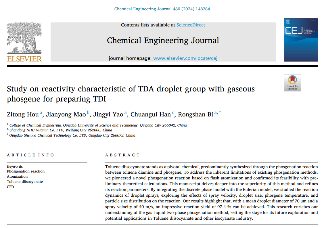 XCSport毕荣山教授团队在TDI制备新工艺研究方便取得新的进展,相关成果以“Study on reactivity characteristic of TDA droplet group with gaseous phosgene for preparing TDI”为题发表在化工领域TOP期刊《Chemical Engineering Journal上》(影响因子15.1,中科院一区Top),XCSport硕士研究生侯梓桐为第一作者,毕荣山教授为论文的通讯作者,该研究得到了山东省自然科学基金的资助。