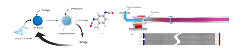 该研究在液滴群体尺度上对甲苯二胺(TDA)的过热液体快速闪蒸成微小液滴并与光气进行反应的行为进行了深入分析。通过构建基于第一性原理的多过程耦合热力学及动力学模型,揭示了新机制下光气化反应过程中物质与能量传递、反应之间的协同作用机制,完善了新技术下制备TDI过程的理论和方法,并优化了喷雾速度、液滴粒径及其分布、以及光气温度等关键工艺参数,实现了相较于目前工艺更高的收率和选择性。此研究为TDI制备新技工艺的工业实现奠定了基础,对于推动异氰酸酯行业的可持续发展具有重要意义。