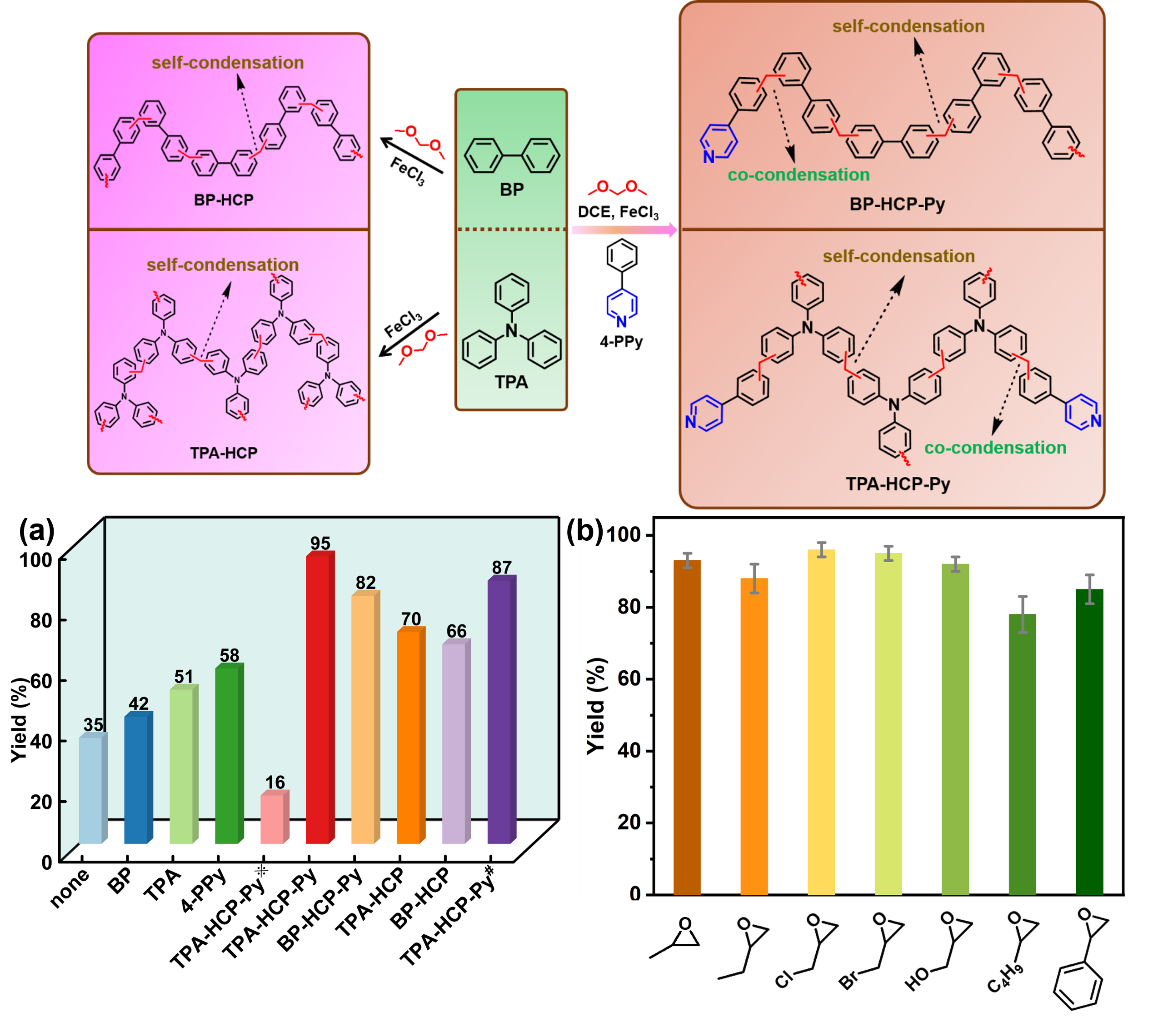 XCSport刘猛帅/刘福胜团队长期围绕CO2高值化利用领域存在的关键科学与技术瓶颈问题开展研究,近年来在CO2高效转化合成有机碳酸酯、喹唑啉-2,4(1H,3H)-二酮、苯丙炔酸、恶唑烷酮及其衍生物等高值精细化学品方面取得了系列进展,创制出了面向不同CO2转化路径的系列多功能催化材料(AIChE J., 2024, e18488; Sep. Purif. Technol., 2024, 329, 125196;J. Colloid Interface Sci., 2024, 656, 24–34; J. Colloid Interface Sci., 2024, 661, 1000–1010)。近日,团队在CO2高效转化合成环状碳酸酯新型多相催化剂的设计与开发方面取得重要研究进展。作者通过合理设计芳香类单体结构,基于傅-克烷基化反应原理,创制了系列超交联多孔有机聚合物催化剂。通过对催化剂的结构与性能进行调控与优化研究,发现该类催化剂可展现出规整的孔隙结构、高的比表面积和优异的稳定性,实现了无溶剂、无金属以及常压条件下高效催化CO2转化合成环状碳酸酯。
