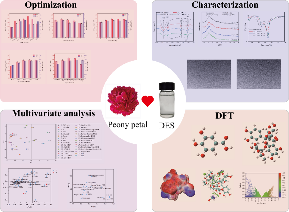 团队利用低共熔溶剂提取牡丹花瓣中酚类和黄酮类化合物,探究了八种不同类型的DES的提取效率。当氯化胆碱、乙二醇和尿素的摩尔比为1:2:2,含水量为30%时,总酚和总黄酮的提取量最高。通过多变量分析,建立了以提取量为目标的关系模型。其中,HBD的参数对总酚和总黄酮的提取量有显著影响。此外,采用量子化学计算以芦丁和没食子酸为目标分子,探究DES与目标分子的相互作用。结果表明,氢键是其中主要的相互作用力。相关研究成果以“Mechanism of deep eutectic solvents based extraction of phenolic and flavonoid compounds from peony petals”为题目,发表在知名国际期刊Industrial Crops & Products(SCI一区TOP期刊),论文DOI链接为doi.org/10.1016/j.indcrop.2024.119947。论文第一作者为2022级硕士研究生王胜林,通讯作者为徐环斐,XC体育为第一单位和唯一通讯单位。