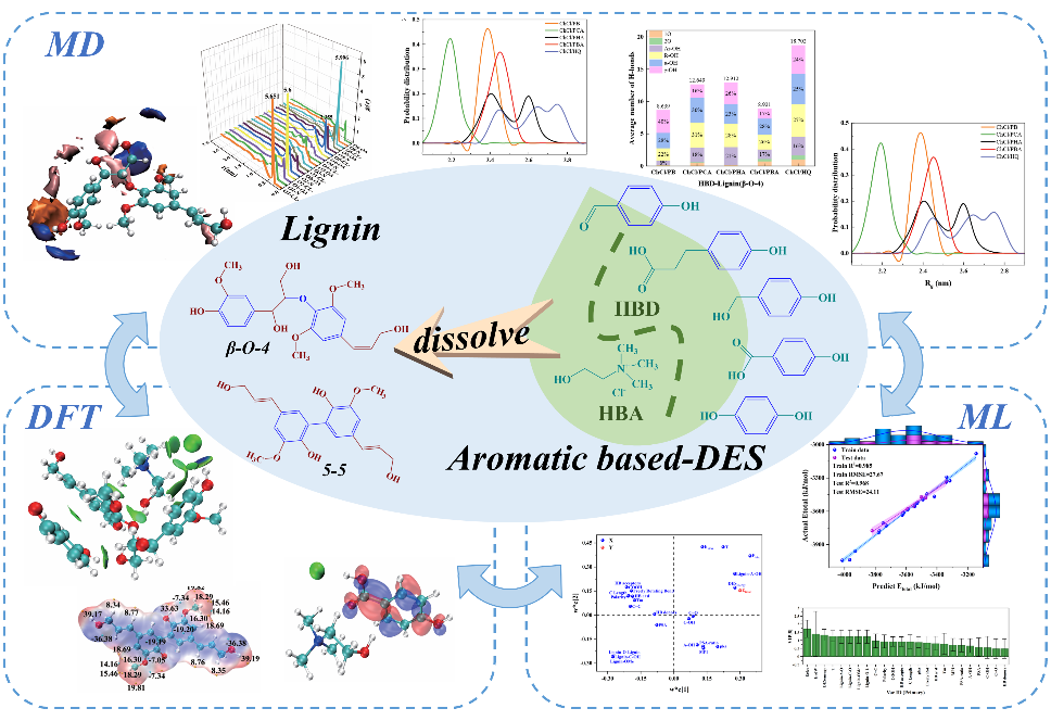 团队采用密度泛函计算、分子动力学模拟和多变量分析等方法,研究了5种芳香基DES与2种木质素二聚体模型的相互作用机理。探讨了溶解温度和芳香氢键给体类型对木质素β-O-4与5-5亚结构单元间连接键或与不同官能团相互作用的影响。在木质素溶解过程中,γ-OH是PB和Cl-作用于木质素二聚体(β-O-4)的首选位点,与γ-OH形成氢键的比例为40%。它分布在木质素二聚体(β-O-4)周围0.28 ~ 0.32 nm处,总相互作用能为-4041.1452 kJ/mol。相关研究成果以“Comprehensive analysis of lignin dimer dissolution microscopic mechanism in different aromatic-based deep eutectic solvent”为题目,发表在生物质化工研究领域国际知名期刊Industrial Crops & Products(SCI一区TOP期刊)。论文第一作者为2021级硕士研究生朱宝平和2022级硕士研究生葛瀚文,通讯作者为徐环斐,XC体育为第一单位和唯一通讯单位。论文DOI链接为10.1016/j.indcrop.2024.119736。