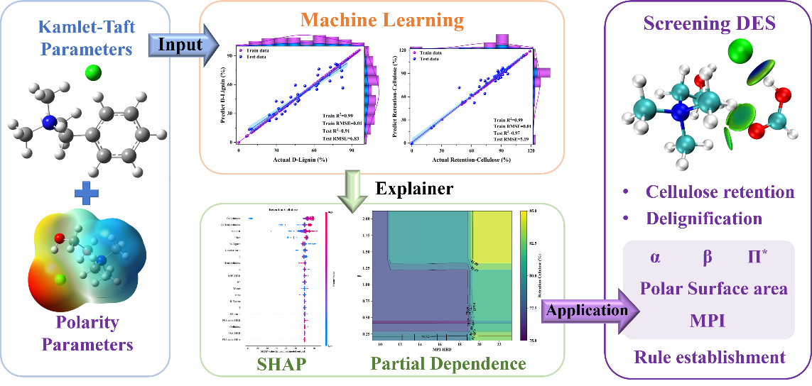 团队结合密度泛函理论和机器学习方法,利用104种低共熔溶剂(DES)的Kamlet-Taft参数和极性值建立了内在关系模型。通过氢键酸度(α)、氢键碱度(β)、极化(Π*)和分子极性指数(MPI)的协同组合,有望筛选出对花卉的根茎叶中纤维素、半纤维素、木质素处理效率高的DES。该模型给出了预处理效率高的参数范围。在本研究给出的4个参数范围内,可以选择DES的组成和比例,以确保至少保留80%的纤维素和去除50%的木质素。分子模拟结果表明,这些高效的DES通常含有大量的氢键和高极性基团。相关研究成果以“Explicable Machine Learning for Predicting High-Efficiency Lignocellulose Pretreatment Solvents Based on Kamlet–Taft and Polarity Parameters”为题目,发表在绿色化学研究领域国际知名期刊ACS Sustainable Chemistry & Engineering(SCI一区TOP期刊)。论文第一作者为2022级硕士研究生葛瀚文,通讯作者为徐环斐,XC体育为第一单位和唯一通讯单位。论文DOI链接为10.1021/acssuschemeng.4c01563。