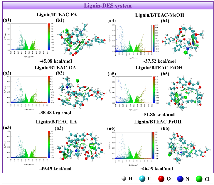团队采用多尺度模拟分析方法研究了苄基三乙基氯化铵(BTEAC)基DES与木质素在分子水平上的相互作用机理。通过分析不同体系中的弱相互作用类型、电荷分布、氢键数、能量分布和密度分布,阐明了六种氢键供体结构对萃取过程的影响。其中,由于甲酸(FA)体积较小,为BTEA+与木质素的接触提供了更多的空间,从而产生更强的相互作用。为BTEAC-FA在预处理过程中去除木质素的效果提供了分子水平的理论基础。相关研究成果以“Microscopic mechanism investigation of extraction of lignin by benzyltriethylammonium chloride-based deep eutectic solvents”为题目,发表在生物质化工研究领域国际知名期刊Journal of Molecular Liquids(SCI一区TOP期刊)。论文第一作者为2022级硕士研究生葛瀚文,通讯作者为徐环斐,XC体育为第一单位和唯一通讯单位。论文DOI链接为10.1016/j.molliq.2024.125996。