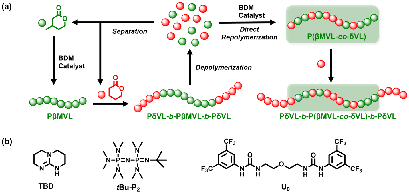 针对这一问题,XCSport沈勇/李志波团队提出了一种新型高韧性可闭环回收TPEs,该材料可以通过生物基β-甲基-δ-戊内酯(βMVL)和δ-戊内酯(δVL)的顺序开环共聚(Ring-Opening Copolymerization, ROP)方法制备,能够在保持优异韧性的同时,实现高效闭环回收。相关研究成果以“Tough and Closed-loop Recyclable Thermoplastic Elastomers from Sequential Ring-Opening Copolymerization of Bio-renewable β-Methyl-δ-Valerolactone and δ-Valerolactone”为题发表在《Advanced Functional Materials》上。