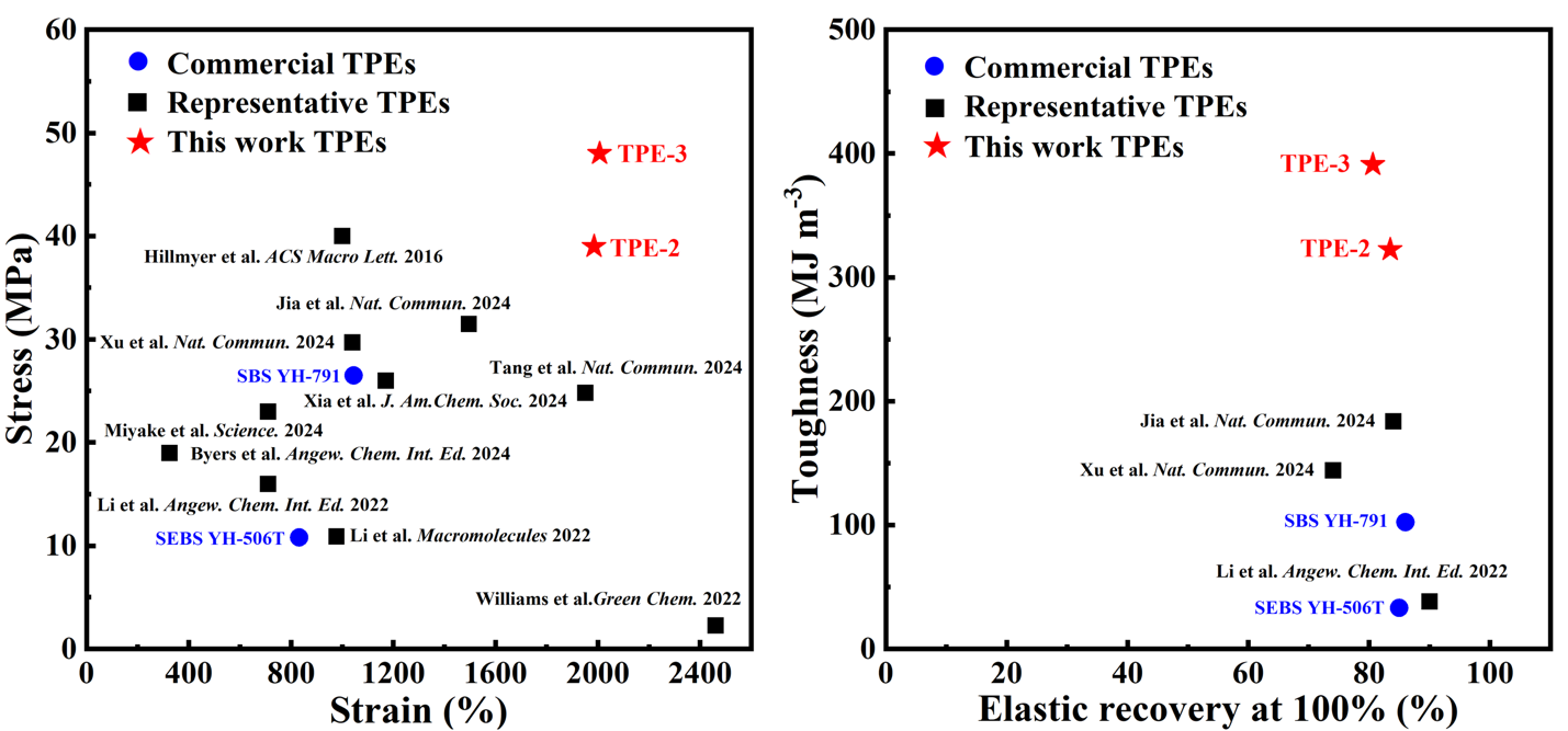 热塑性弹性体(Thermoplastic Elastomers, TPEs)因其兼具热塑性塑料的可加工性和传统橡胶弹性体的高弹性,在汽车、电子、医疗和日用消费品等领域具有广泛的应用。然而,传统TPEs材料主要来源于石化资源,用后难以降解回收,会导致严重的环境污染问题。开发性能媲美商品化弹性体,同时用后可回收的TPEs是推动材料绿色化发展的关键。