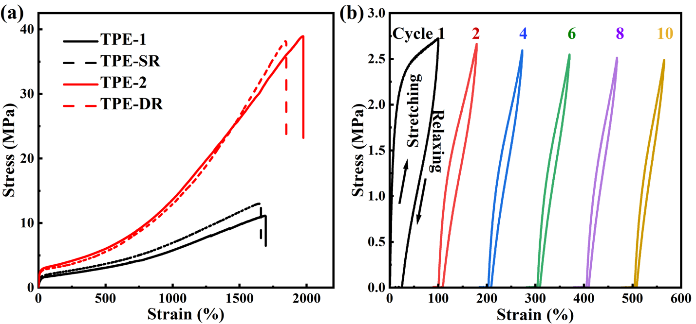所制备的TPEs具有优异的力学性能,其中拉伸强度最高可达50 MPa,断裂伸长率超过2000%,显著优于大多数可回收TPEs(图2)。此外,该材料在循环拉伸测试中表现出较高的弹性恢复率(>90%)和较低的残余应变,为高性能弹性体的应用奠定了基础。