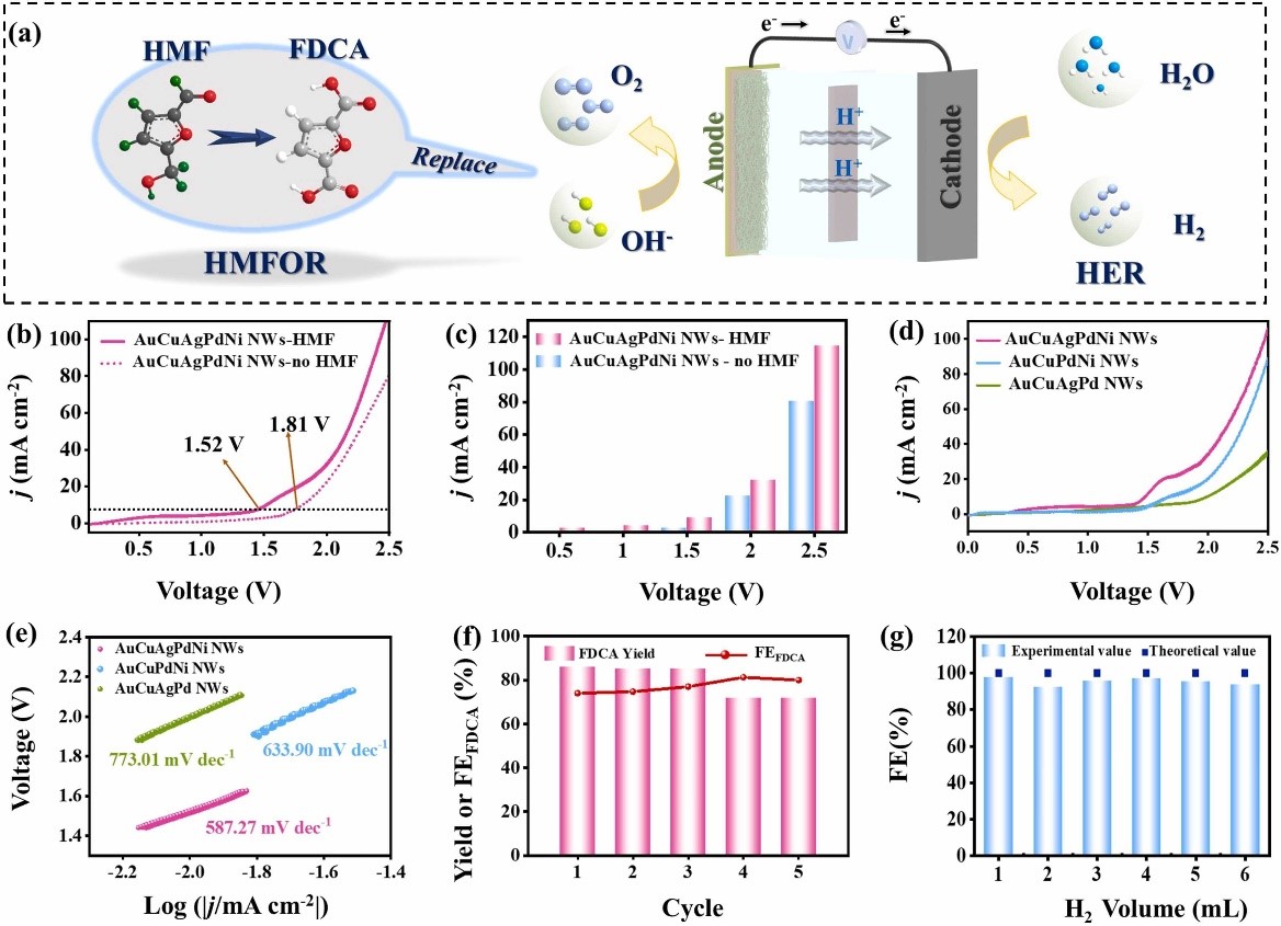 总之,该研究采用一锅湿化学法合成了高熵合金纳米线催化剂。系统研究表明,AuCuAgPdNi纳米线具有较低的电荷转移电阻和较高的电化学表面积。此外,将HMFOR与析氢反应偶联后,实现了同步绿色HMF的氧化和H2的析出。该研究揭示了高熵合金系统的创新合成和内在催化机制,为生物质的增值转化提供了有效策略。