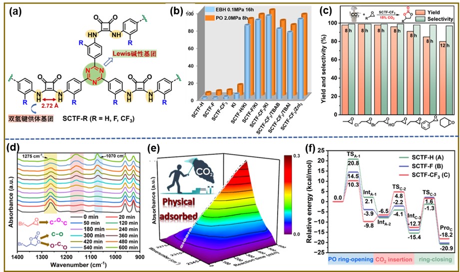近日,XCSport刘猛帅/刘福胜团队在合理设计功能单体的基础上,采用简易离子热共缩聚法,成功创制出系列方酰胺衍生基三嗪有机框架(SCTF-R;R = H, F, CF3)催化剂,并系统研究了其结构特性。结果表明该新型催化剂具有高比表面积(605-833 m2/g)与规整的孔隙结构,同时包含高密度氢键供体与CO2亲和位点。在273 K和1.0 bar CO2压力下,SCTF-CF3对CO2吸附能力达2.5 mmol/g;将SCTF-R应用于低浓度CO2与环氧化物的环加成反应,对比研究了催化剂活性位点及反应工艺参数等因素对产品收率和选择性的影响,发现以SCTF-CF3为催化剂,在温和、无金属、无溶剂条件下可高效催化低浓度CO2转化合成溴丙烯碳酸酯,展现出优异的催化活性和循环稳定性。这主要归因于催化体系中活性位点的合理构建及其协同作用,显著增强了对CO2的吸附活化以及环氧化物的活化与开环能力。