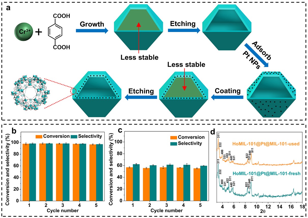 针对上述问题,XCSport王英龙/郑奉斌团队开发了一种“晶体生长和后蚀刻”的合成方法,构筑出了以Pt纳米粒子为夹层、以中空HoMIL-101为内核层和以MIL-101为外壳层的空心三明治结构催化剂,即HoMIL-101@Pt@MIL-101。该催化剂在140oC和0.1 MPa的氢气压力下实现了香草醛的完全转化以及对2-甲氧基-4-甲基苯酚100%的选择性,并具有良好的稳定性。在相同转化率下,其活性约为实心结构MIL-101@Pt@MIL-101的9倍,且综合性能优于商用的Pt/C催化剂以及目前报道的非均相催化剂。