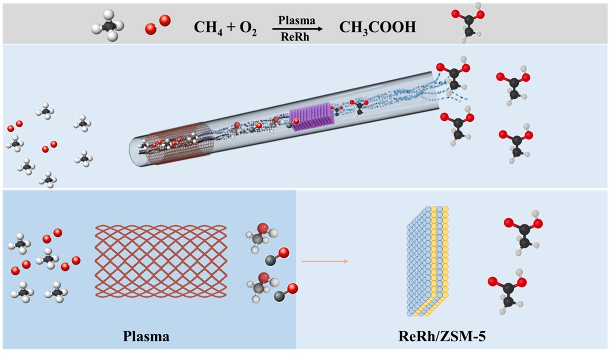 甲烷作为天然气的主要成分,其选择性氧化为高附加值化学品(如乙酸)是可持续石油化工的重要方向。然而现有甲烷选择性氧化方法仍存在两个关键问题:(1)受限于甲烷C-H键活化和C-C耦合的动力学难题,难以实现高效转化。(2)以水为溶剂促进产物脱附,抑制过氧化的同时大幅降低产物浓度(毫摩尔范围),分离成本巨大。为解决这些问题,研究团队创新性地提出等离子体与热催化协同的串联反应策略,耦合等离子体催化甲烷氧化制甲醇/CO与热催化甲醇羰基化制乙酸步骤。该过程突破了热力学平衡限制,高效选择性活化甲烷(甲烷转化率达68.0%),同时抑制积碳和CO2生成。通过调控催化剂表面疏水性,显著抑制副产物水对反应的干扰。在无卤代试剂辅助的条件下,乙酸选择性达52.0%,浓度达1.3mol/L,较传统单催化模式产物浓度提高了3个数量级,并具备100小时以上的长效稳定性,解决了传统催化剂易失活的问题。规避了甲醇和CO分离步骤,实现从甲烷和氧气一步合成乙酸,为甲烷转化开辟新路径。