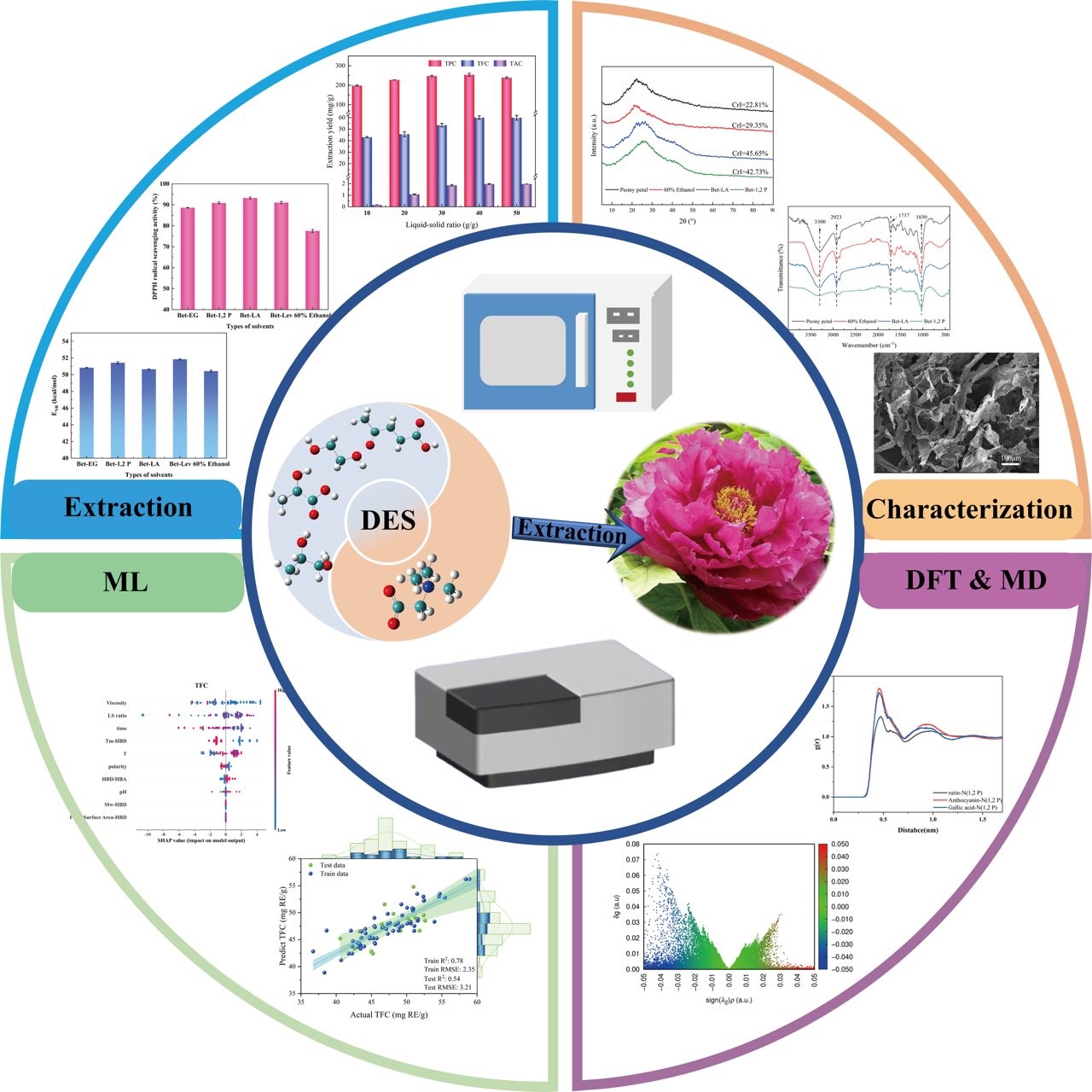 团队提出了微波辅助深共晶溶剂萃取(MAE-DES)法从牡丹花瓣中提取活性化合物。以DES的四种不同成分作为提取溶剂,通过总酚含量(TPC)、总黄酮含量(TFC)和总花青素含量(TAC)评估提取效果。响应面法用于优化反应温度、反应时间和液固比。结果表明,在优化条件下,TPC、TFC和TAC的提取率分别为321.59mg GAE/g、61.65mg RE/g和2.15mg C3GE/g。固体残留物的表征表明,DES有效地破坏了牡丹花瓣的结构。此外,通过机器学习研究了影响提取效率的变量的重要性。最后,通过密度泛函理论和分子动力学模拟探讨了DES对活性化合物的提取机理。结果表明,活性化合物的提取效率受到与DES氢键相互作用的影响。为多种方法联合提取活性化合物提供了有效的提取方案和机制研究。