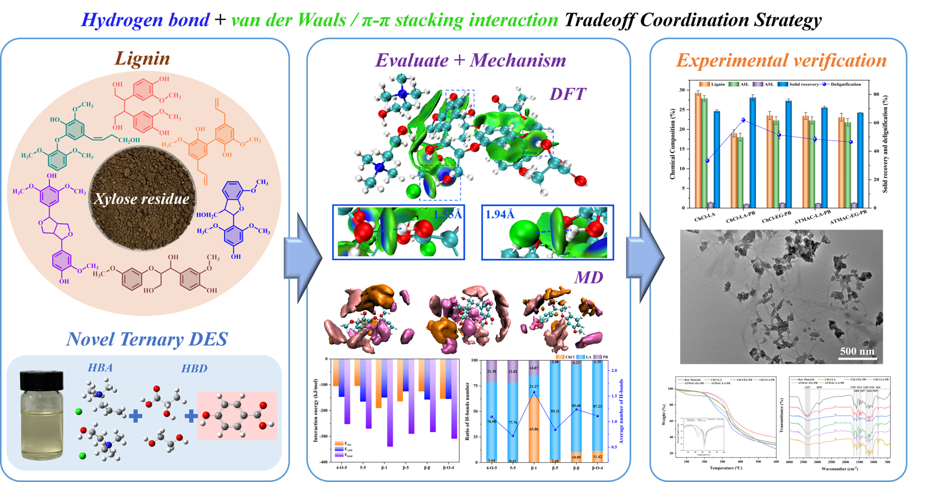 团队为解决溶剂-生物质体系分子层面机制理解的局限性,改善仅提升体系单一相互作用的缺陷。采用氢键、vdW相互作用、π-π堆积协同提升DES脱除木质素能力的新策略合成了4种新型三元DES。基于DFT的量子化学计算和分子动力学模拟的结果表明,氯化胆碱和对羟基苯甲酸平均贡献了DES-木质素体系中84.26%的静电能和68.72%的vdW相互作用能,其相继提升21.60%和27.71%组分中的Cl-、-OH等基团能够与木质素形成丰富的氢键。受苯环上邻位取代基的影响,在考察的6种木质素二聚体中,β-1和β-O-4与DES的相互作用更强。ChCl-LA-PB(计算相互作用能最强,达到-92.37 kcal/mol)的脱木质素能力在对木糖残渣的处理实验中得到了展现,木质素的脱除率相较于ChCl-LA提升了1.86倍(达到61.91%)。并采用TEM和2D HSQC NMR等表征方法探究了新型三元DES对木质素亚结构的影响。