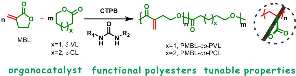 α-亚甲基-γ-丁内酯(MBL)也叫郁金香灵A,是一种天然生物基单体分子,可以通过衣康酸转化得到。由MBL开环聚合制备的聚酯具有双键侧基,可以进一步利用Michael加成反应或“thiol-ene Click”反应进行后修饰。MBL同时具有稳定的五元环内酯结构和高活性环外双键,如何抑制双键加成反应的同时实现MBL的开环聚合是一项重大挑战。XC体育沈勇博士在之前的工作中利用有机磷腈碱/脲二元催化体系,首次实现了有机催化MBL的选择性开环聚合(CCS Chem.2020,2, 620-630)。最近,XC体育沈勇、刘福胜团队在前期工作的基础上,报道了有机磷腈碱/脲二元催化体系实现MBL与其他环内酯(ε-己内酯或δ-戊内酯)的选择性开环共聚,成功制备得到侧基双键官能团含量可调控的系列功能化生物基聚酯(如下图)。