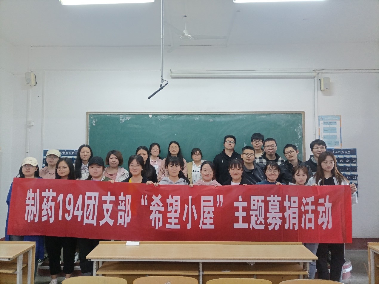 5月27日下午,制药194班团支部开展“希望小屋”主题募捐活动。本次团日活动由班长汤涛,团支书孙一萌及班委组织,制药194班全体成员参与。