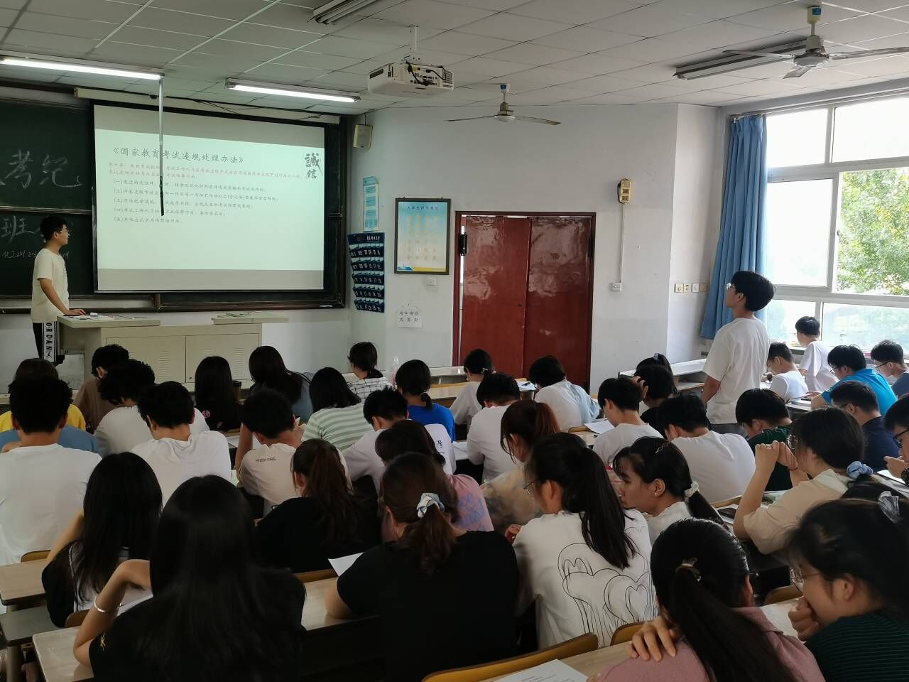 班会上,各位班委组织员工学习《XC体育员工纪律处分管理规定》等文件,通过签订诚信考试承诺书,学习考试违纪警示教育材料等形式,教育同学们诚信考试,使同学们充分认识考试违纪的严重后果,从思想源头上根除作弊动机,引导同学们争做有德性、守契约、讲诚信的科大人。