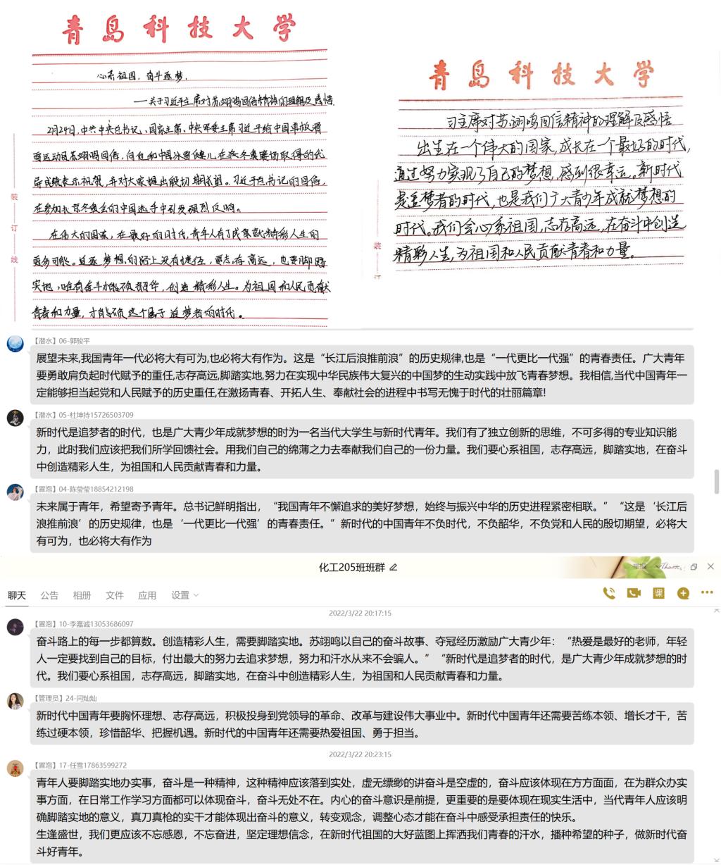 为贯彻学习习近平总书记给中国冰雪健儿的回信精神,引导同学们牢记习近平总书记勉励,努力做到将“个人梦”融入“中国梦”,志存高远,脚踏实地,3月21日-3月22日,XCSport化工205班全体同学结合疫情防控相关要求下采用线上线下相结合的方式进行回信精神学习。