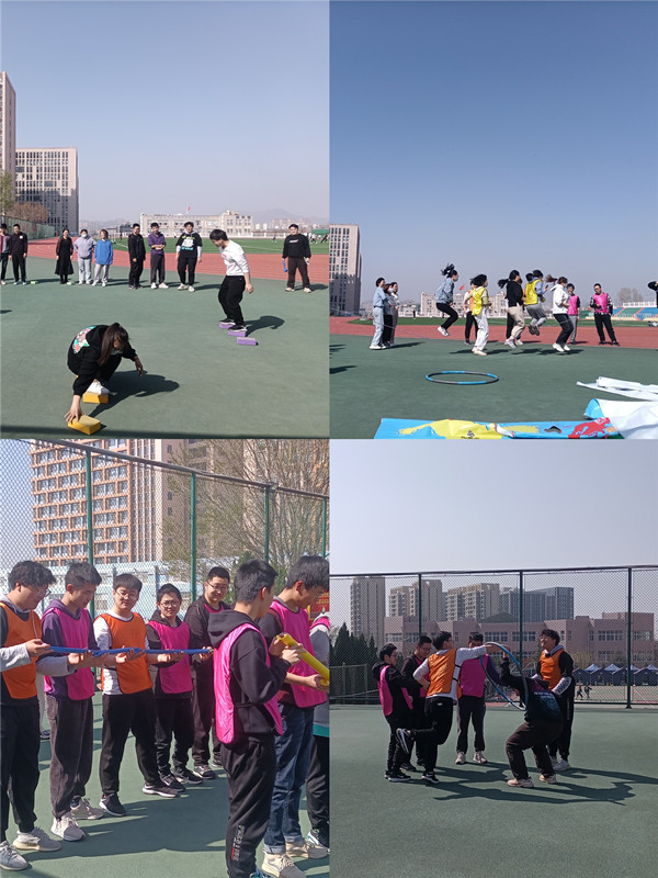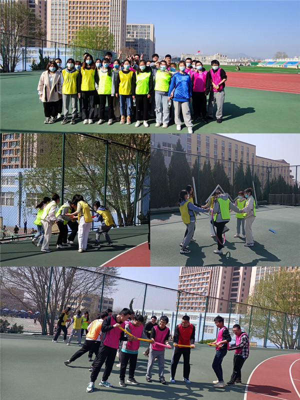 在活动开始前,班级同学以宿舍为单位分组,穿上不同颜色的马甲,活动设置了“一圈到底”、“摸石头过河”、“跳大绳”、“两人三足”等拓展项目。各队制定自己的策略,队友之间紧密配合、互帮互助。大家在游戏中放松心情,缓解压力,收获友谊。