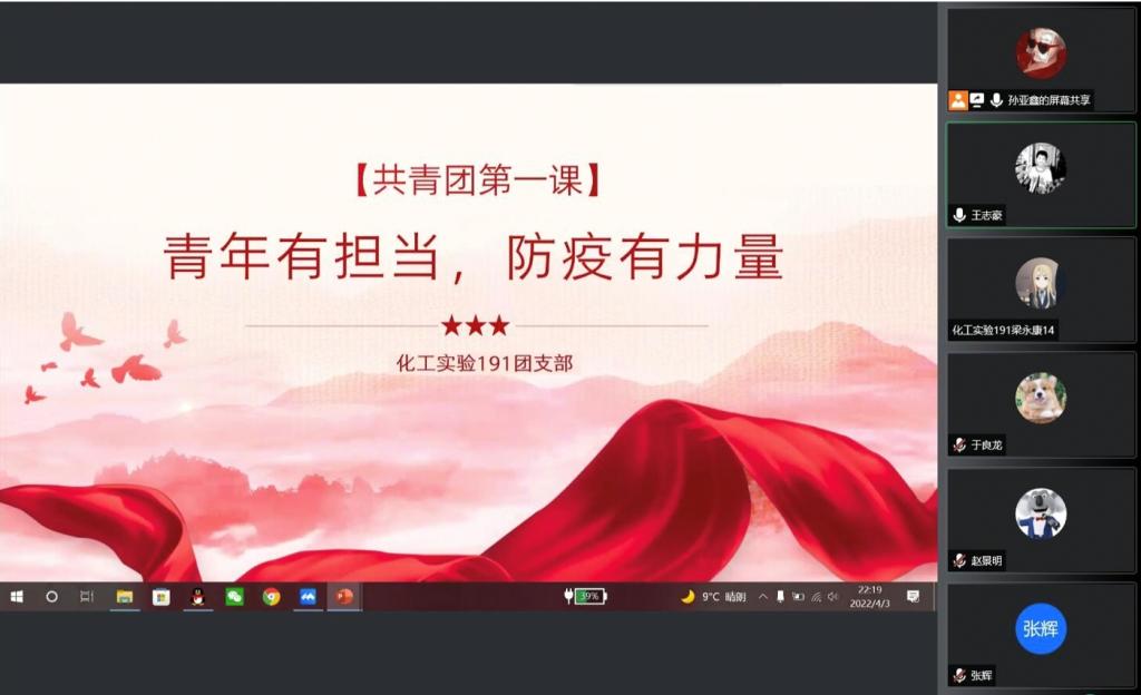 4月2日,化工实验191团支部开展线上主题宣讲,团支书通过ppt的方式,向大家宣传近期国内、山东省以及青岛市疫情动向和变化,详细介绍公司应对防疫所采取的相关措施,要求大家严格遵守公司疫情防控要求,积极科学应对疫情,做到不信谣、不传谣,弘扬积极主旋律。随后,班内三个同学们分享了疫情防控志愿者的经历,向大家分享了感受和收获,号召同学积极投身志愿活动,展现科大青年的担当与作为。