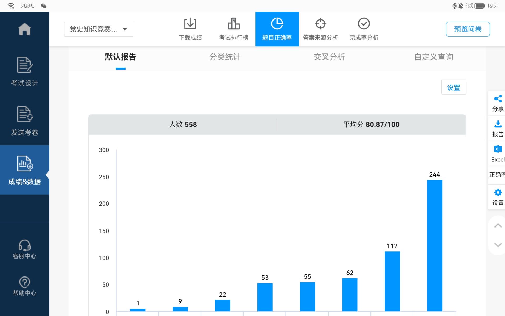 本次活动面向XCSport全体员工,通过班代会和扬帆化工QQ号进行前期的活动宣传,动员和呼吁各个班级的同学积极参加活动。参加比赛的同学扫描二维码即可进入网页进行答题,截止到5月4日,此次竞赛的初选圆满结束,558名同学参加了本次党史知识竞赛。