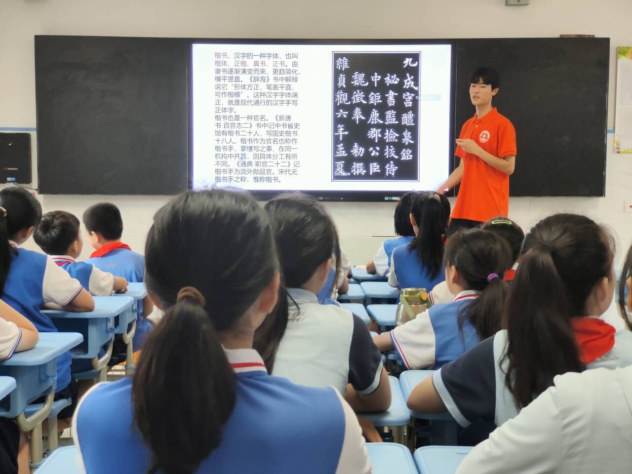 书法是中国古典艺术的一朵奇葩,它是一种独特的艺术形式,而且源远流长。教育关爱团成员李凯通过自己多年的学习,向小朋友们介绍中华传统书法。首先,他从书法的起源讲起:从甲骨文、金文到篆书,从草书到隶书、楷书、行书。他结合照片分析了不同传统字体的特点。接着,他带领小朋友们练习了简单的字体,去感受楷书的“顿笔”与“回锋”。最后,他强调了练出一手好字的重要性,宣扬了中华优秀的书法文化,让小朋友在练习书法的过程中感受博大精深的中华文化。