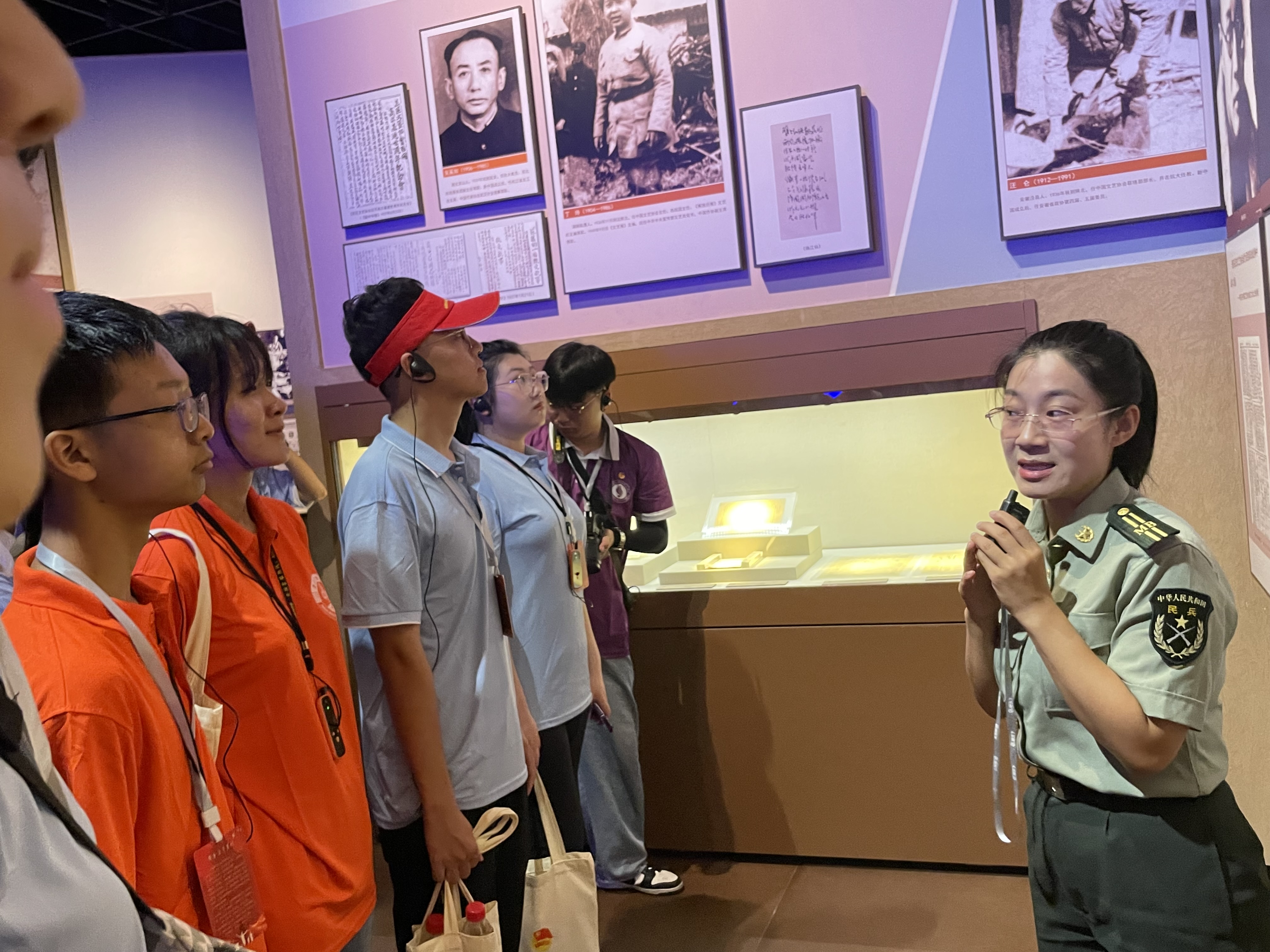 8月12日上午,实践队抵达抗大纪念馆。走进去,一面巨大的抗大校旗映入眼帘。校旗上镌刻着“团结、紧张、严肃、活泼”的八字校训,这八字校训反映出了人民群众的“喜闻乐见”。在纪念馆内部,队员们参观了以实物、图片、雕像、壁画等多种形式的展品。从中队员们了解到了抗大的历史背景,建校理念以及学子们的学习生活。队员们也了解到了从抗大走出的英雄将领,其中不乏罗荣桓等大家耳熟能详的人物。队员们仔细观看每一件展品,感受着历史的厚重和共产党的艰苦奋斗。