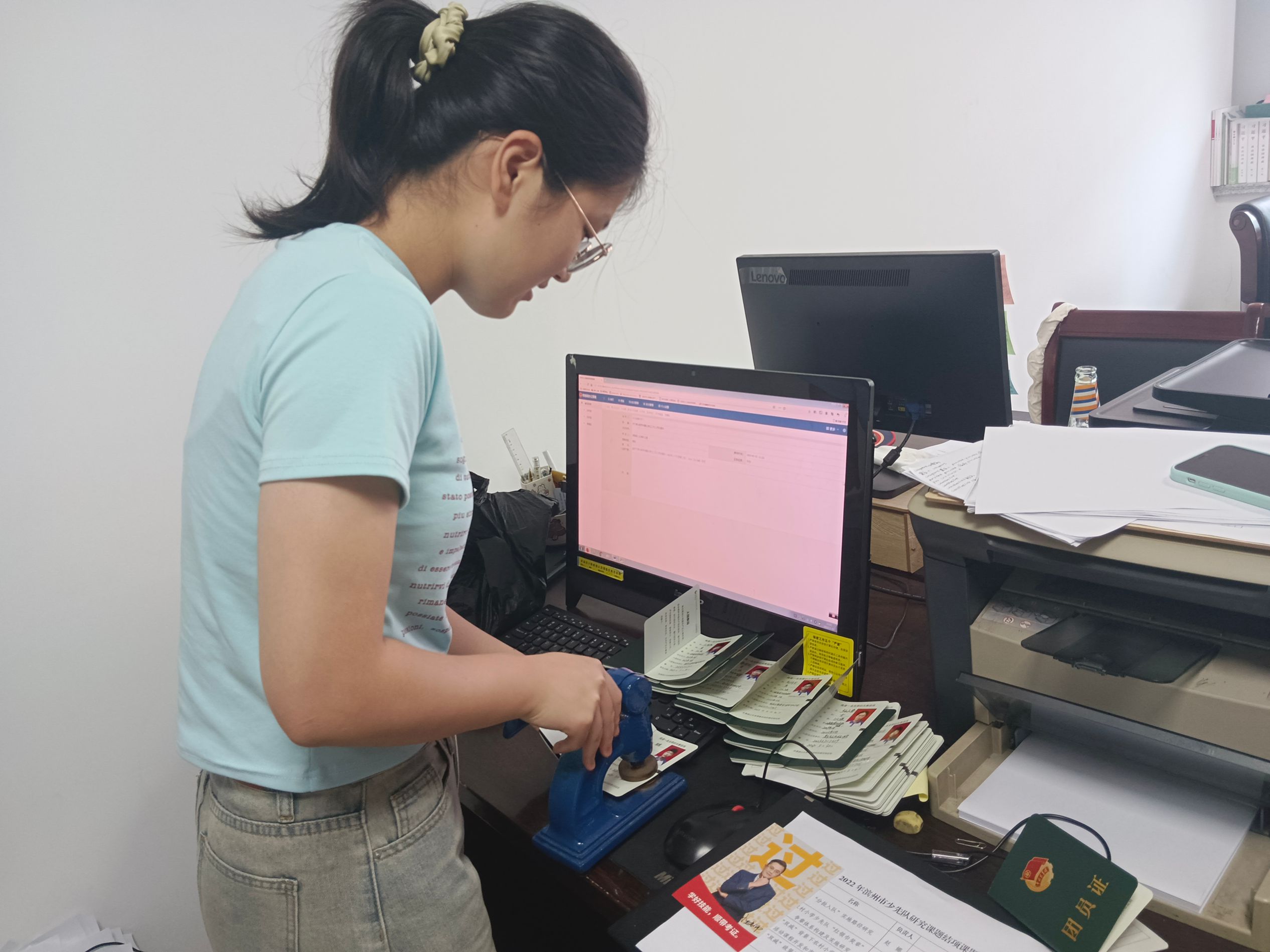 暑假期间,化学工程与工艺226班杨晓慧来到山东省滨州市阳信县团委办公室进行实习,主要工作内容是协助办公室人员完成工作以及乡村音乐节的筹备与组织,其中包括制作表格、整理表格、打印相关材料、联系相关人员、撰写与检查推文、分发服装等。