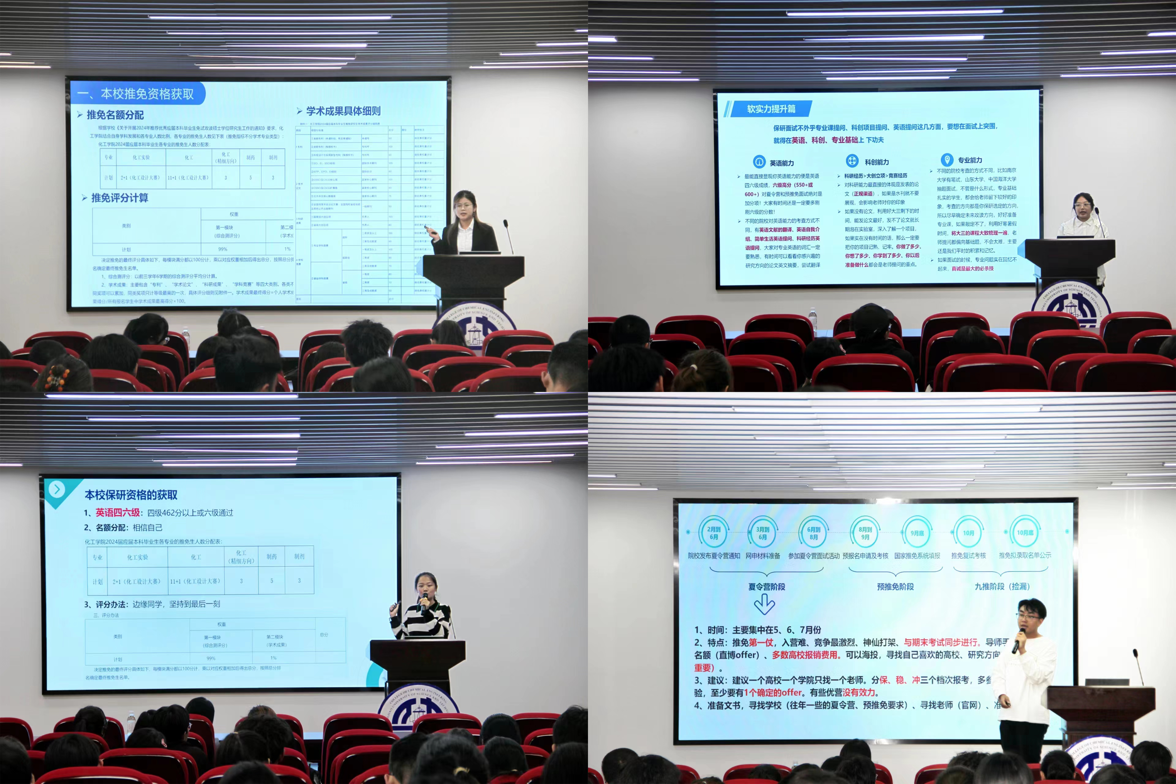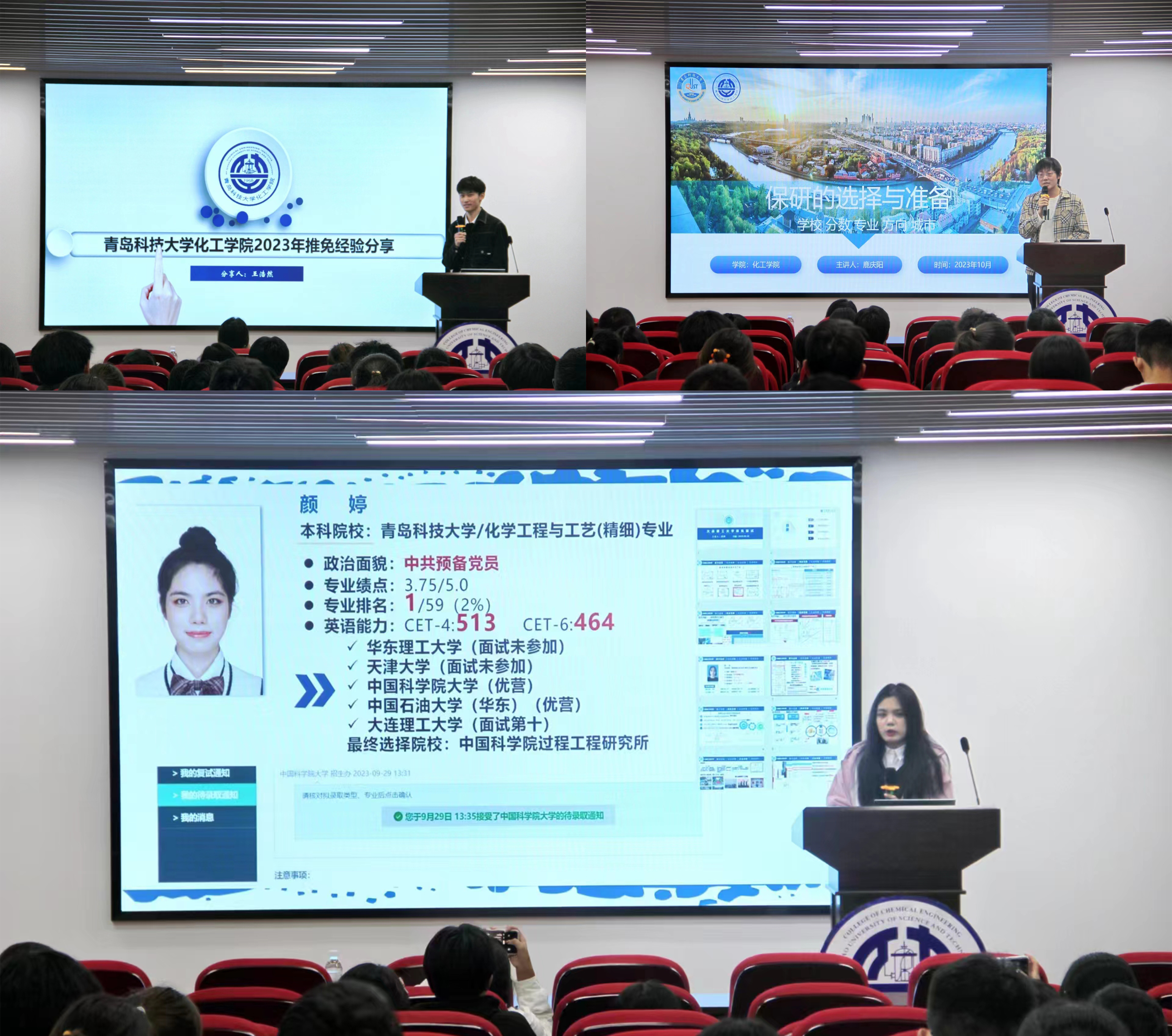 会上,保送至浙江大学的程玉帅讲解了大学夏令营、预推免的时间段以及面试时的提问特点,为同学们保研的准备拨清迷雾,指明方向;保送至中科院化学所的王浩然结合自身经历,分享了不同院校录取资格获取的方式及核心竞争力;保送至四川大学的鹿庆阳详细讲解了保研的具体流程,并提醒同学们实时关注心仪院校的报名时间;保送至天津大学的庞博着重分享了参加科技创新竞赛相关经验;保送至天津大学的王颖着重强调了个人专业能力、科研成果以及科研经验的重要性;保送至中科院过程所的颜婷强调了对专业实验的熟悉度、相关的术语组织能力以及保研心理准备的重要性;保送至中科院过程所的王小洁详细剖析了保研流程,讲述不同时间节点要做的准备工作。七位保研同学的精彩分享赢得了现场热烈的掌声,同学们积极提问,分享同学耐心回答,现场气氛热烈活跃。