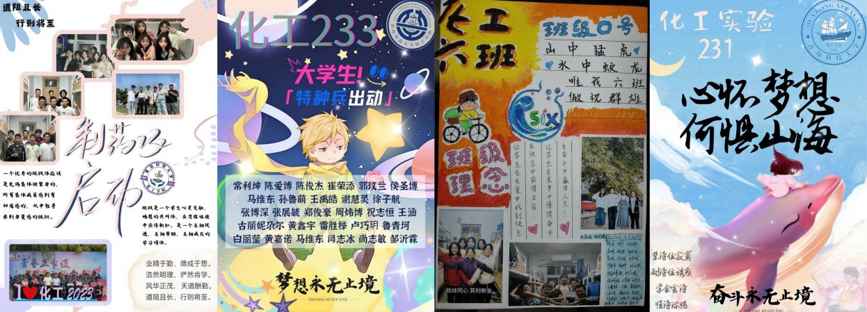在此次大赛中,同学们积极参与,充分发挥自己的想象力和设计才能,各班班徽设计细节生动,主题突出,形象表现出23级新生的蓬勃朝气。其中,化工234班班徽以山水为形,高山流水,意境深远,一句“千里之行,有志为先,学途漫漫,少年当先”展现了同学们勇攀高峰,各怀青云之志的班级风貌;还有班级将校训与班训结合,鼓励班级同学共勉,心怀梦想,团结一致;也有班级将班训以及全班同学的名字刻在班徽上,再加以合照点缀,展示出了该班级的团结一心,众志成城。