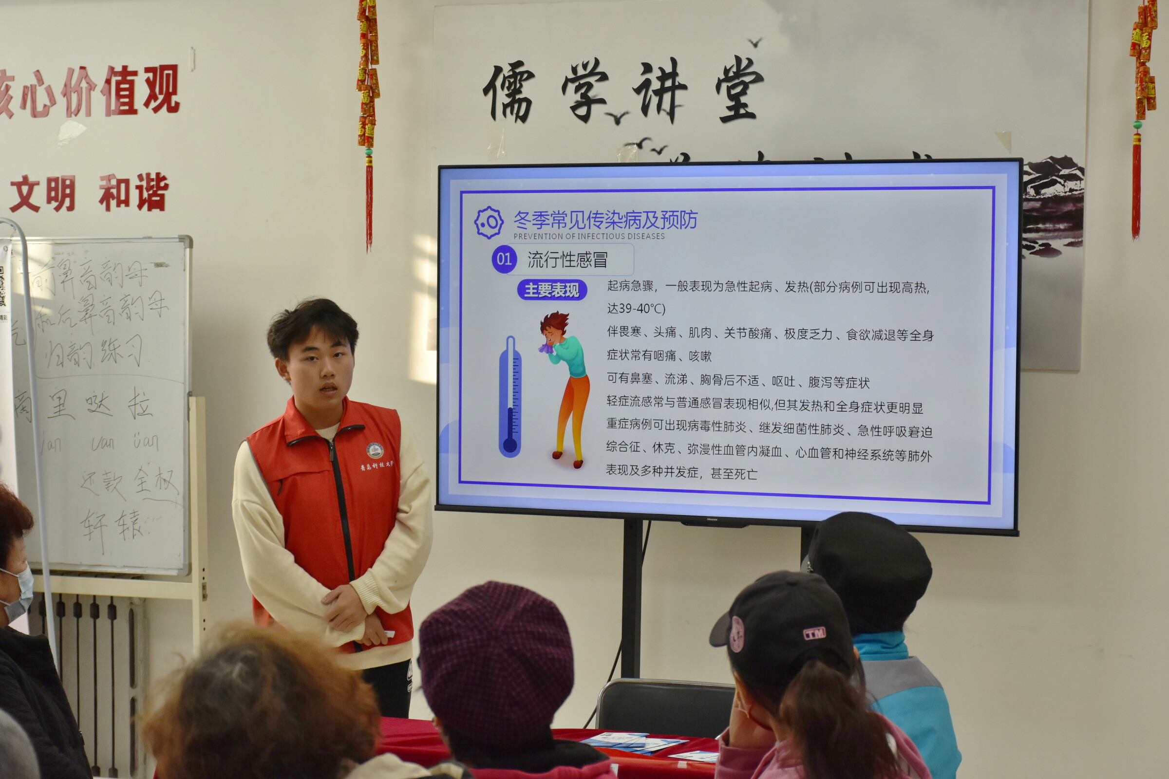 志愿者结合中老年人的生理特点,围饶冬季的气候特征,向居民普及流感、肠道传染病、呼吸道传染病等常见传染病的传播途径、主要症状、易感人群及预防措施,引导居民要注意个人卫生,养成良好的卫生习惯,加强体育锻炼,增强机体免疫力。同时,呼吁大家在日常生活中养成良好的生活习惯,增强体魄,以此抵抗传染病的侵袭,积极推广健康的生活方式。