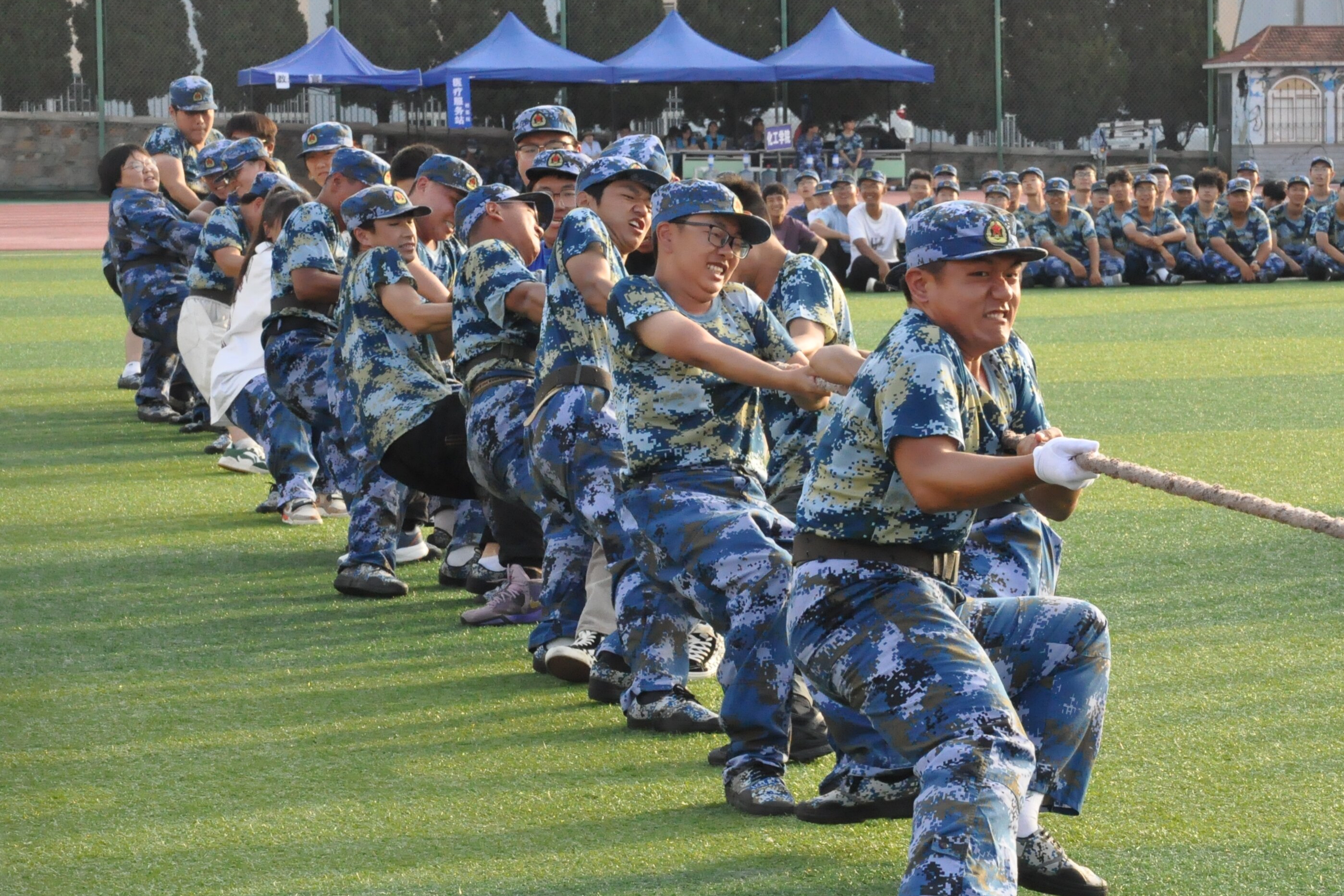 拔河比赛以连为单位,共有五支队伍进行比赛,采取小组淘汰制。比赛前,各连教官为参赛同学做了详细的技术指导。比赛期间,同学们摩拳擦掌,斗志昂扬。他们紧握麻绳,双脚用力蹬地,身体后倾,齐心协力地往后拉。未参赛地同学们自发组织成啦啦队,在队伍旁加油助威。经过激烈角逐,三连队伍获得本次比赛第一名,二连获得第二名,一连获得第三名。
