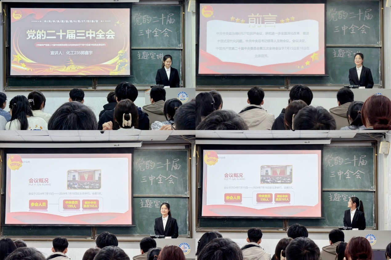 本次宣讲由化工235班郭鑫宇同学主讲,内容紧扣2024年7月15日至18日在北京召开的中国共产党第二十届中央委员会第三次全体会议精神,围绕会议召开的背景、主要议题、重大决策与会议成果进行了深入解读。宣讲回顾了改革开放以来历届三中全会的历史任务与发展脉络,强调了党的二十大以来在党和国家事业发展中取得的重要进展,深入分析了中国式现代化的内涵、方向与目标,同学们准确理解“深化改革”在新时代强国建设过程中的关键作用。