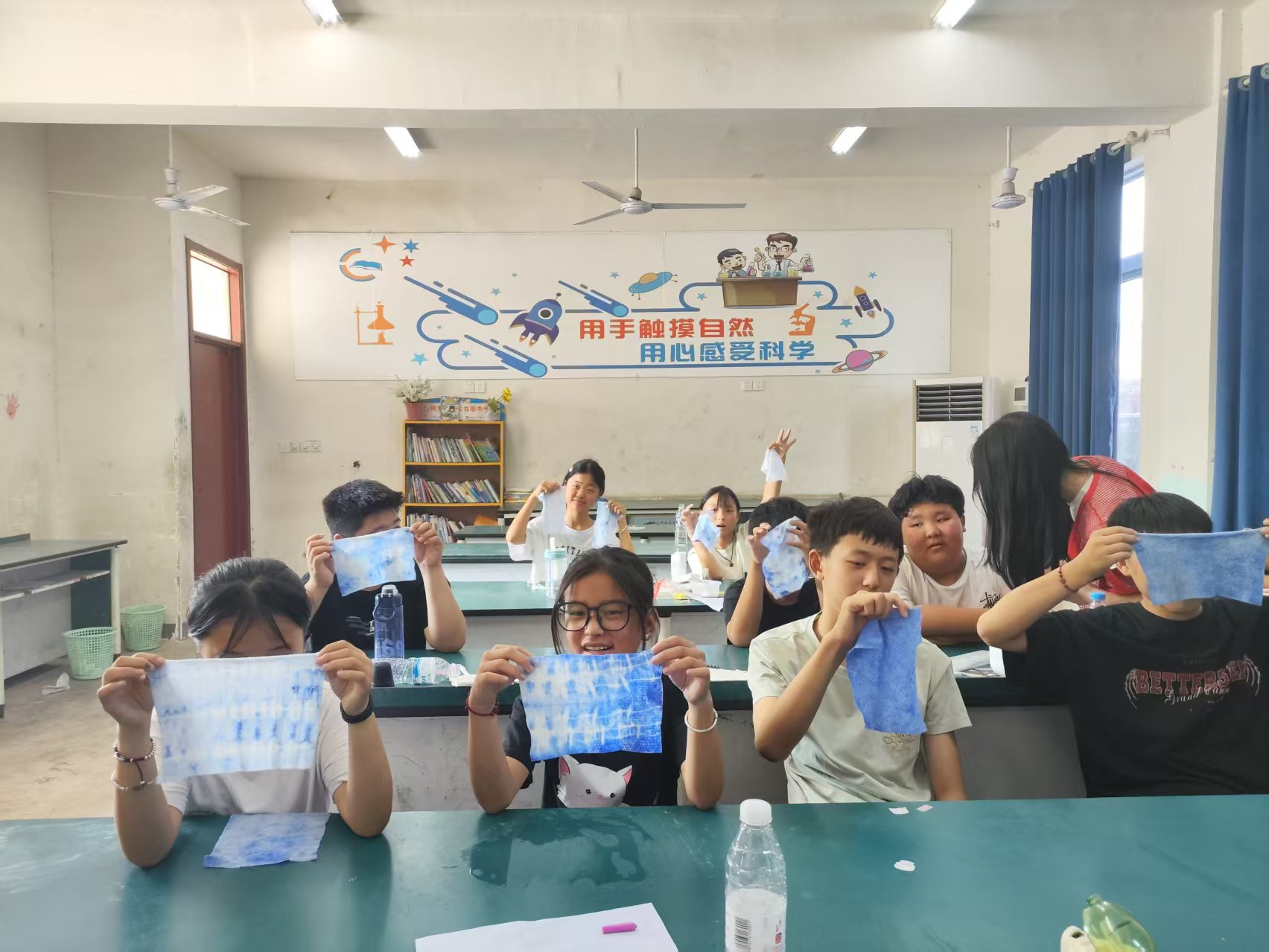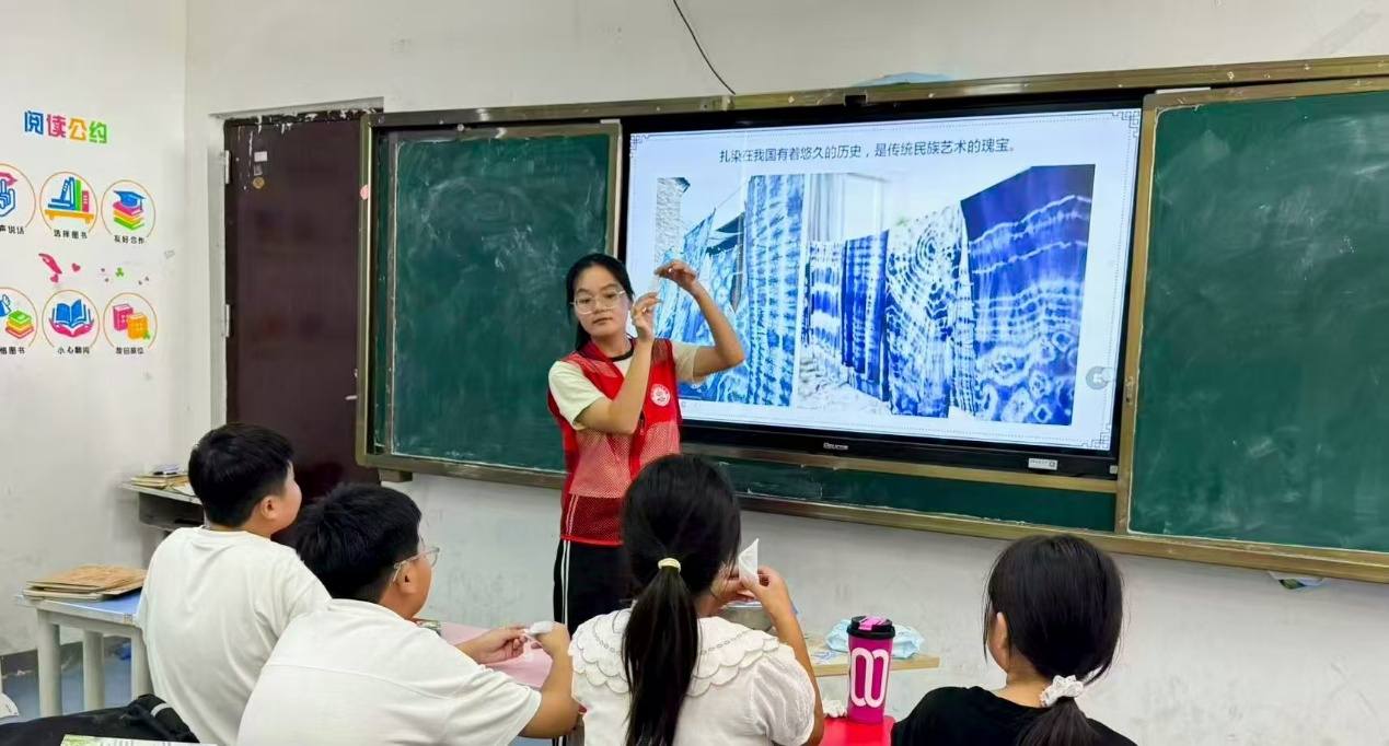 扎染课则让孩子触摸传统工艺的温度。志愿者站在屏幕前,讲解“扎染是传统民族艺术的瑰宝”,随后指导孩子将白布折叠、捆绑,浸入染料。当蓝白相间的纹样在布料上晕染开来,孩子们兴奋地举起作品,“原来白布能变这么好看!”