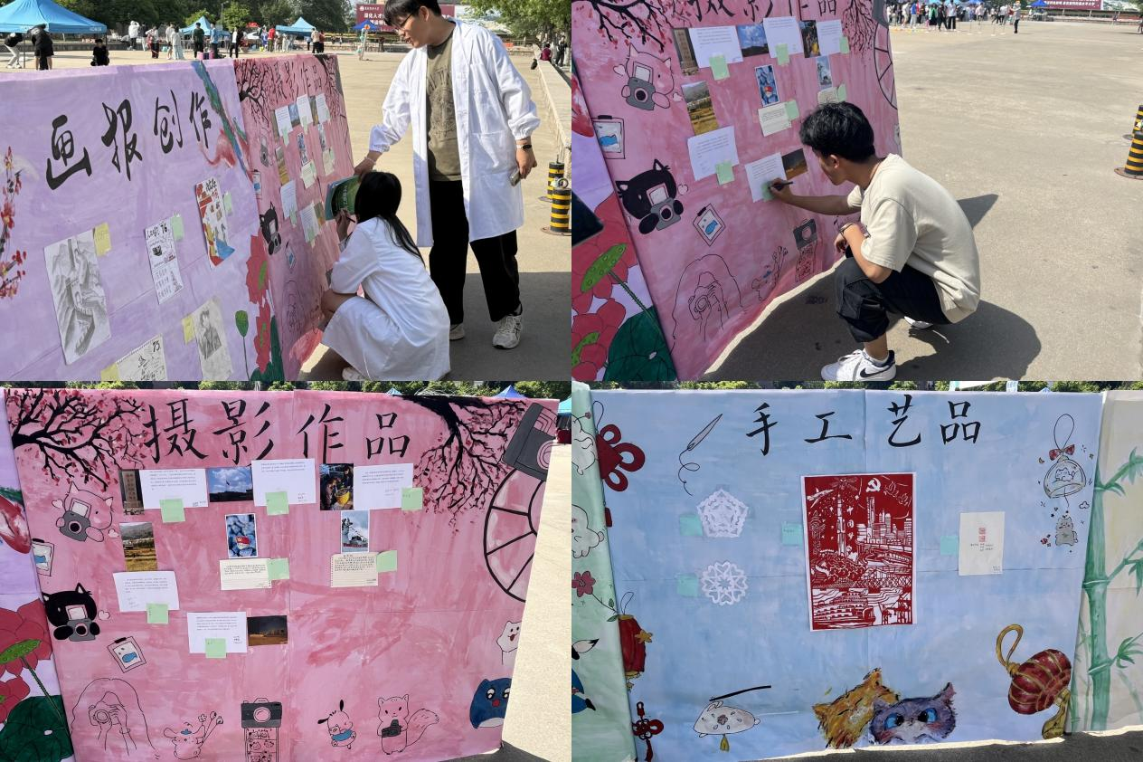 活动现场氛围热烈,一幅幅优秀作品整齐陈列,涵盖摄影、画报、书法、诗歌创作、手工艺品等多种形式。这些作品主题鲜明、内涵丰富,从不同角度展现了同学们对祖国的热爱与祝福,彰显了青年学子积极向上的精神风貌和独特的艺术视角。活动设置了丰富多样的互动环节,吸引众多同学踊跃参与。同学们纷纷前往小五四广场与作品合影留念,在浏览作品过程中,大家认真欣赏每一幅作品,为自己喜爱的作品投出宝贵的选票。
