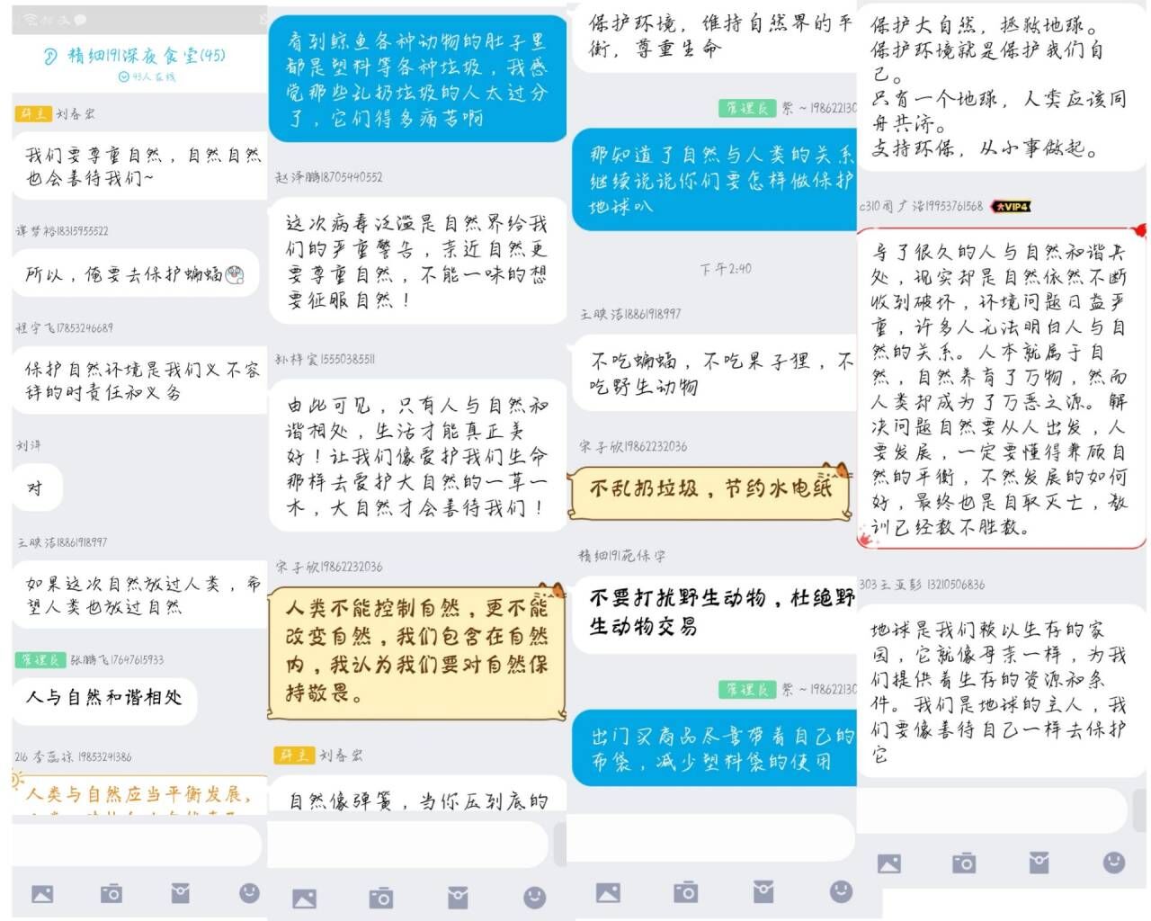 活动中,精细191班同学结合“澳大利亚山火持续数月”,“新型冠状病毒的爆发”,“喜马拉雅山红雪”等话题进行线上讨论人类与大自然的关系,就最近网上出现“是不是大自然开始报复人类”的话题讨论,同学们也围绕这一方面说了自己的见解并结合自身说了将如何为保护环境做出贡献。