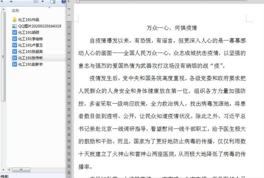 3月5日18:00,化工191班“线上抗‘疫’征文比赛”于线上QQ平台举行。活动由班长李成林、团支书卢雪玉组织开展,其余班委协助,全班共有25人参加。