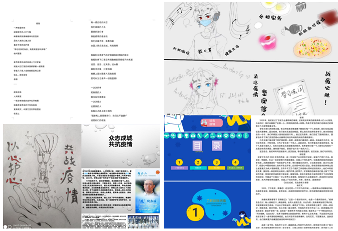 大家将所想所感用文字或图画的方式表达出来,既肯定了祖国对防控的一系列措施,又表达了全国人民众志成城,共抗疫情的决心。从政府到社会基层,从精尖科技人员到平凡的医生护士,全国人民都参与到了这场战斗中,尽一份力发一份光。