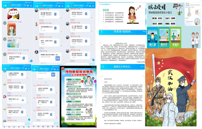 在这次交流学习中,同学们准备了各种各样的素材。有的同学设计了抗疫小贴士,介绍了如何预防新型冠状病毒,赞扬了医护工作者,呼吁同学们万众一心,共同抗疫。有的同学致白衣天使一封信,信中歌颂了白衣天使义无反顾响应国家号召,坚守抗疫一线,不怕苦,不怕累,舍小家为大家的无私奉献精神。也表示了对医务工作者身体状况的担忧,相信平时工作认真细致负责的医护人员,在这场没有硝烟的战争中一定能照顾好自己,白衣天使加油!还有的同学介绍了白衣天使的感人小故事,有国士无双,侠之大者钟南山,有身患渐冻症却仍坚守抗疫最前线的武汉金银潭医院经理张定宇……他们是时代的楷模,是人民的英雄,待春暖花开之时,他们定会平安归来。虽然无法见面,但同学们都积极配合积极响应,相互交流,相互学习,感悟颇深。