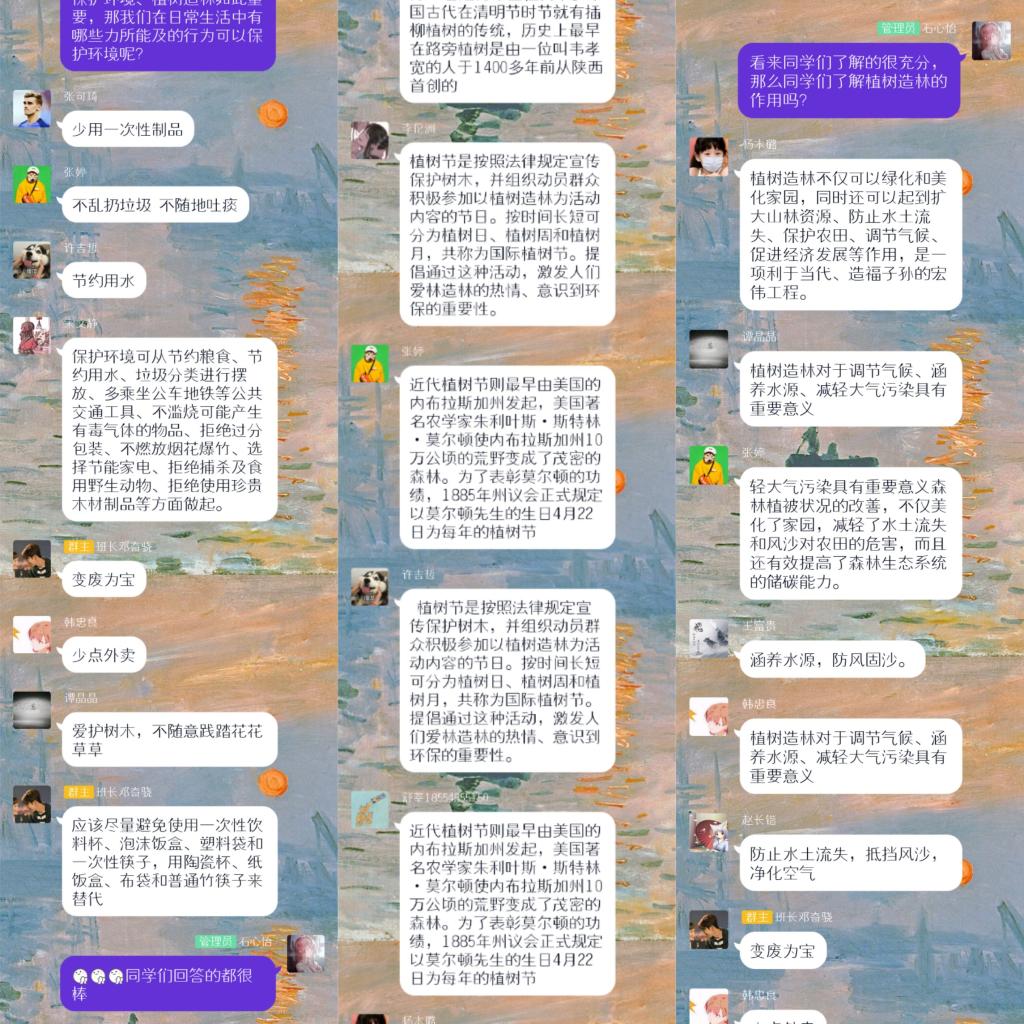 通过此次线上主题团日活动,同学们了解了有关植树节的相关知识,增强了环保意识,也坚定了同学们维护校园自然环境的信心。
