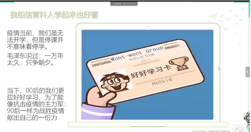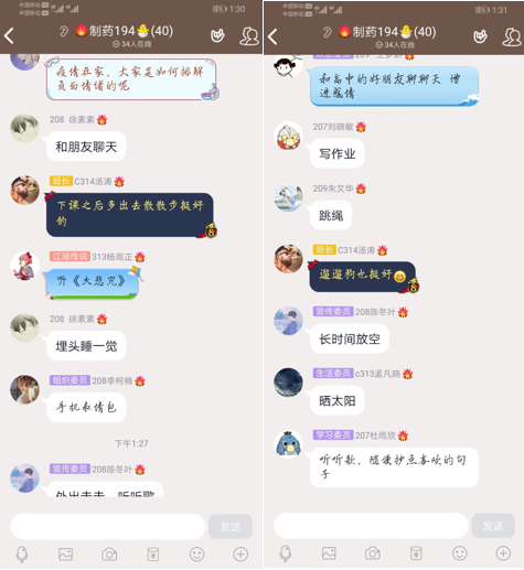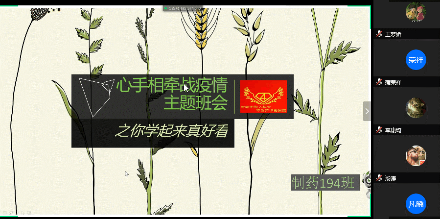 为了引导同学们正确认识和对待疫情,学习相关心理知识,保持正常生活规律,增强自我防疫意识和共渡难关的信心,尽快适应停课不停学的网上学习课堂,增强班级集体凝聚力。4月5日,制药194班在心理委员牛晓宇的带领下于线上召开“心手相牵战疫情”主题班会。
