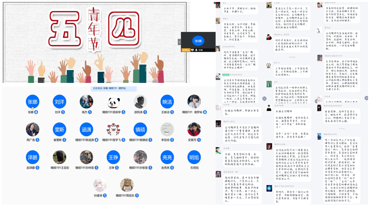 5月4日下午,XCSport精细191班在团支书张娜的主持下以网络连线的形式举行“共述五四情”主题班会活动,此次班会分为主持人讲解和自由讨论两部分。